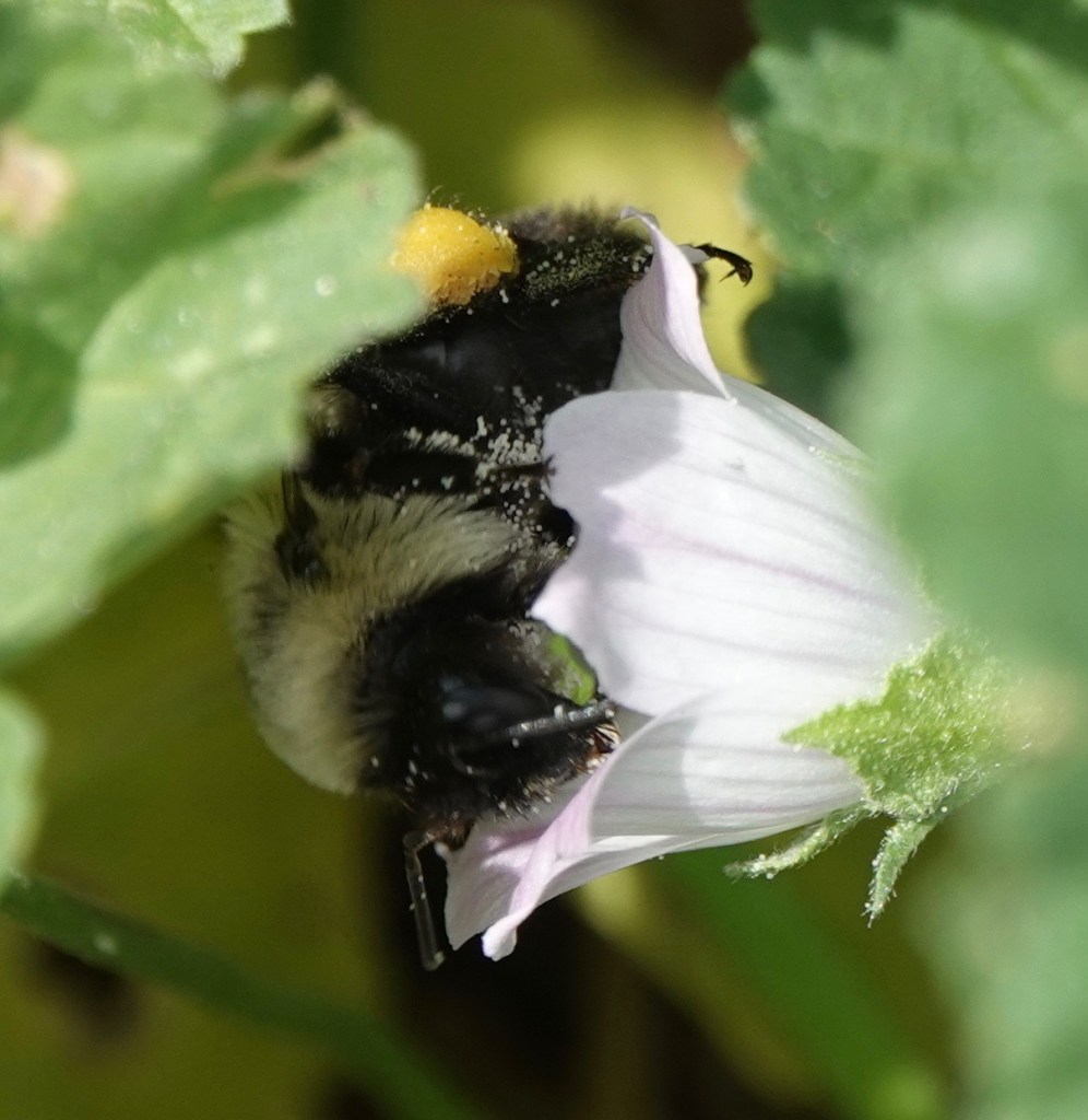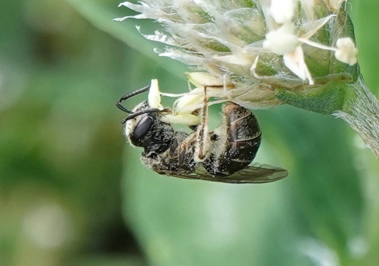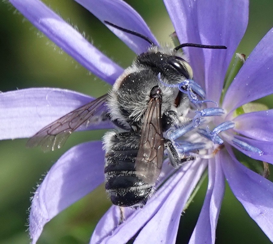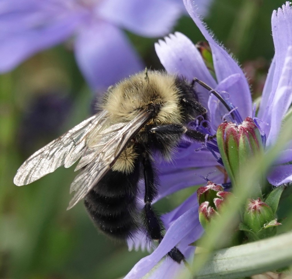 Last Sunday, we saw quite a bit of insect activity along a patch of Sunset Park where the Chicories and other flowers had gone wild. These are just the bees, but three species of wasp and several species of flies were readily visible, too. It looked like Parks was suddenly enlightened, leaving the patch to grow and bloom. I came back with the camera the next day, Labor Day, and found most of that habitat cut down. The no-budget Parks Department had mown on a holiday weekend. Luckily, there was another patch nearby. For now.