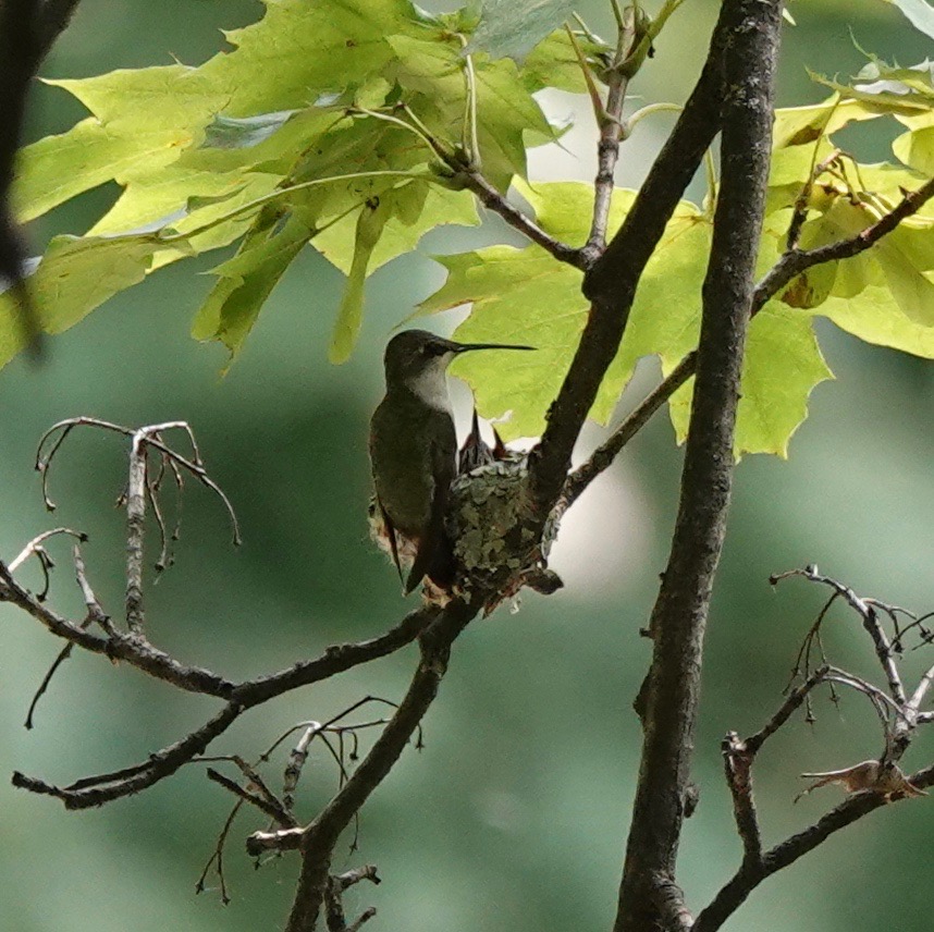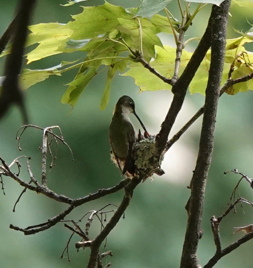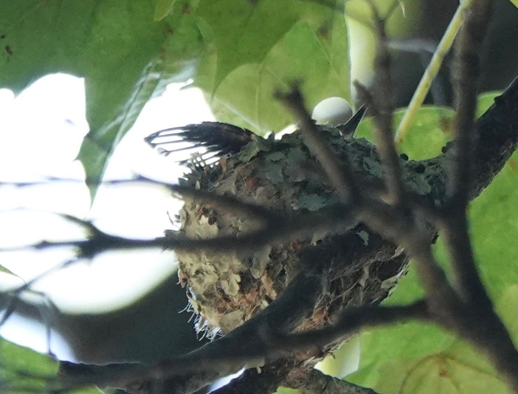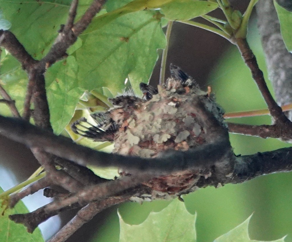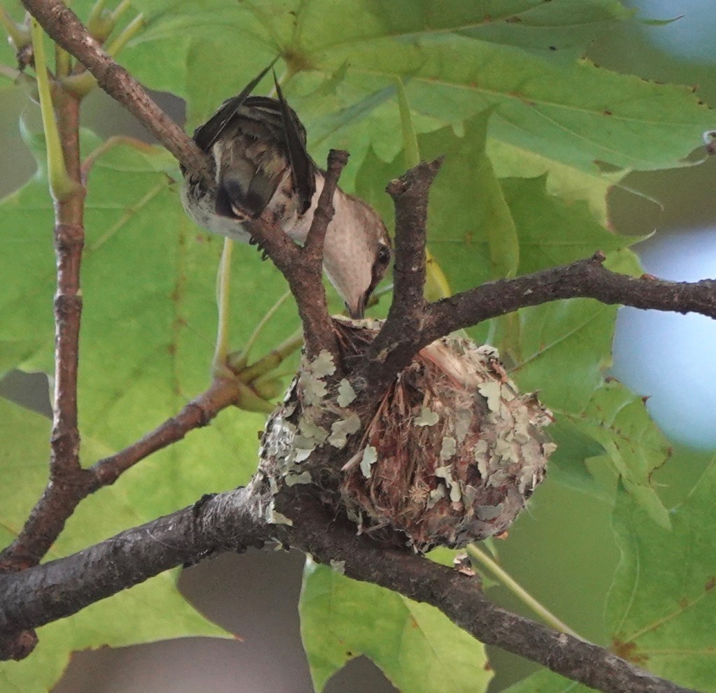 Hummingbirds are currently in migration, so this is prime season for seeing them around here. But a nest in September!? This is late. Hurry up and fledge!