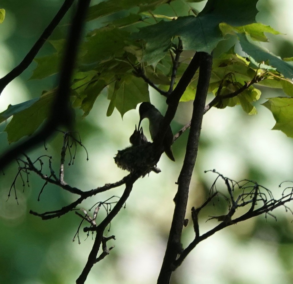 They had been shown a Ruby-throated Hummingbird nest on Rob Jett’s Green-Wood bird walk earlier that day. The tiny lichen-covered cup was a challenge to spot, but soon after I had it in view the mother came back with food.