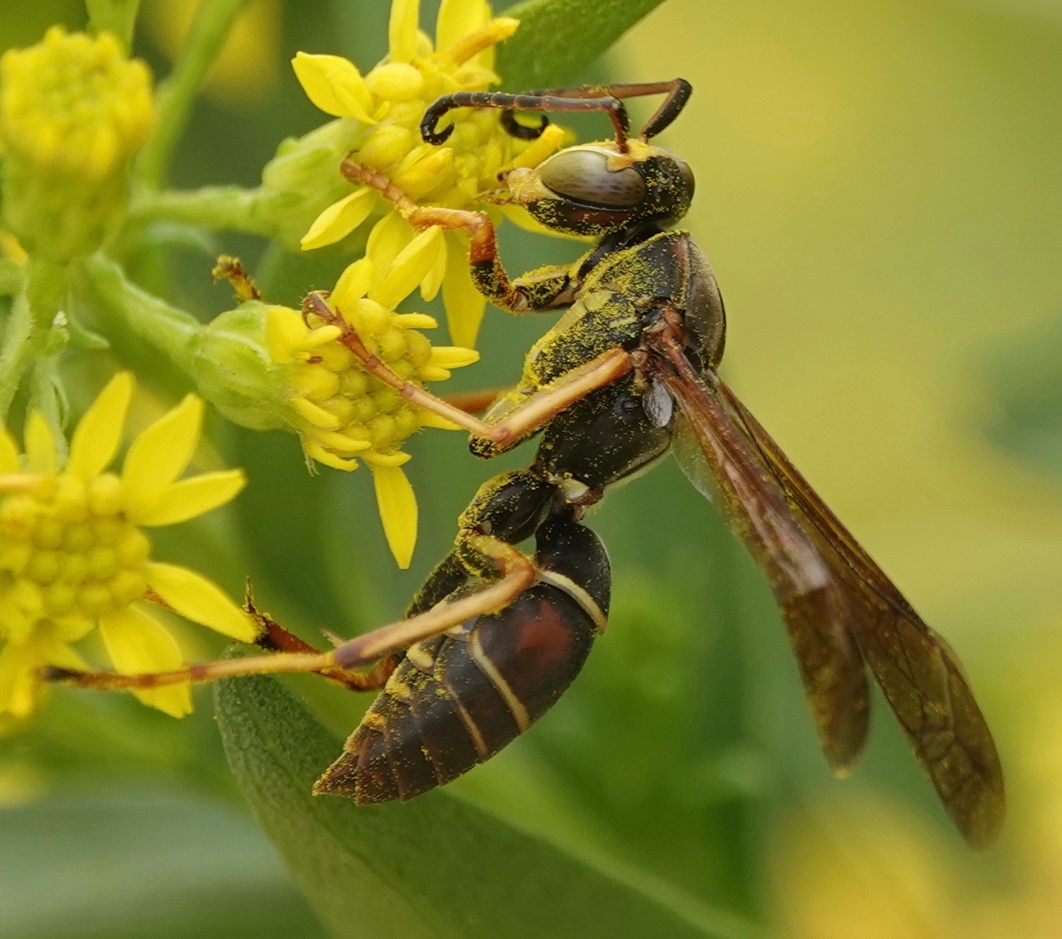 They are not as hairy as most bees, but wasps can also pick up and transport pollen when they’re feeding on nectar. This Northern Paper Wasp/Polistes fuscatus on goldenrods flowers is a case in point.