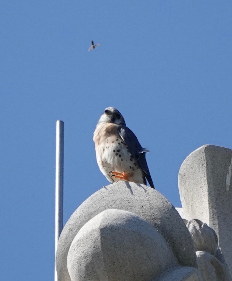 Papa Kestrel atop the Old Chapel has some wasp attendents.