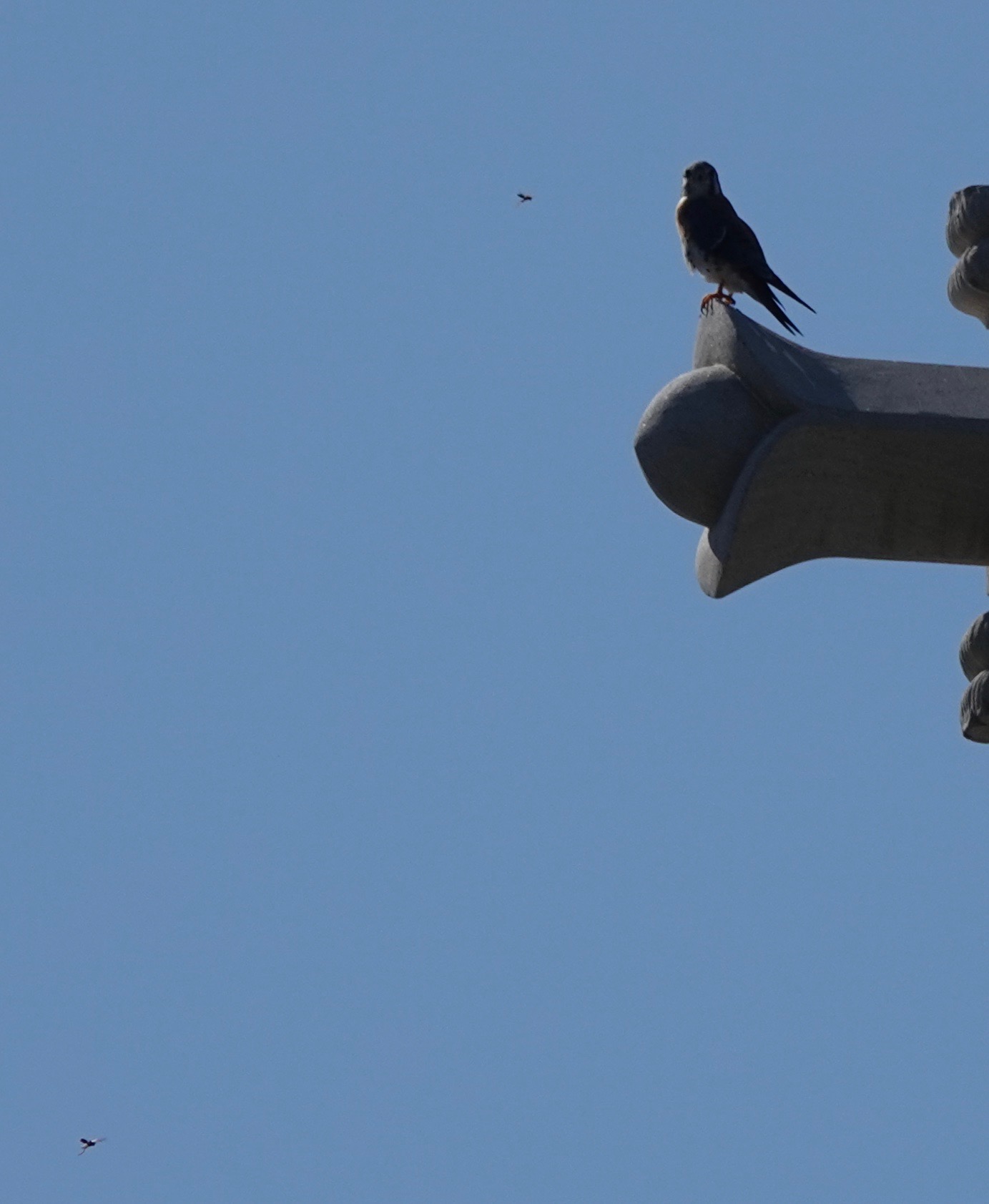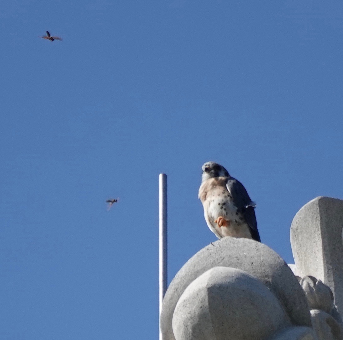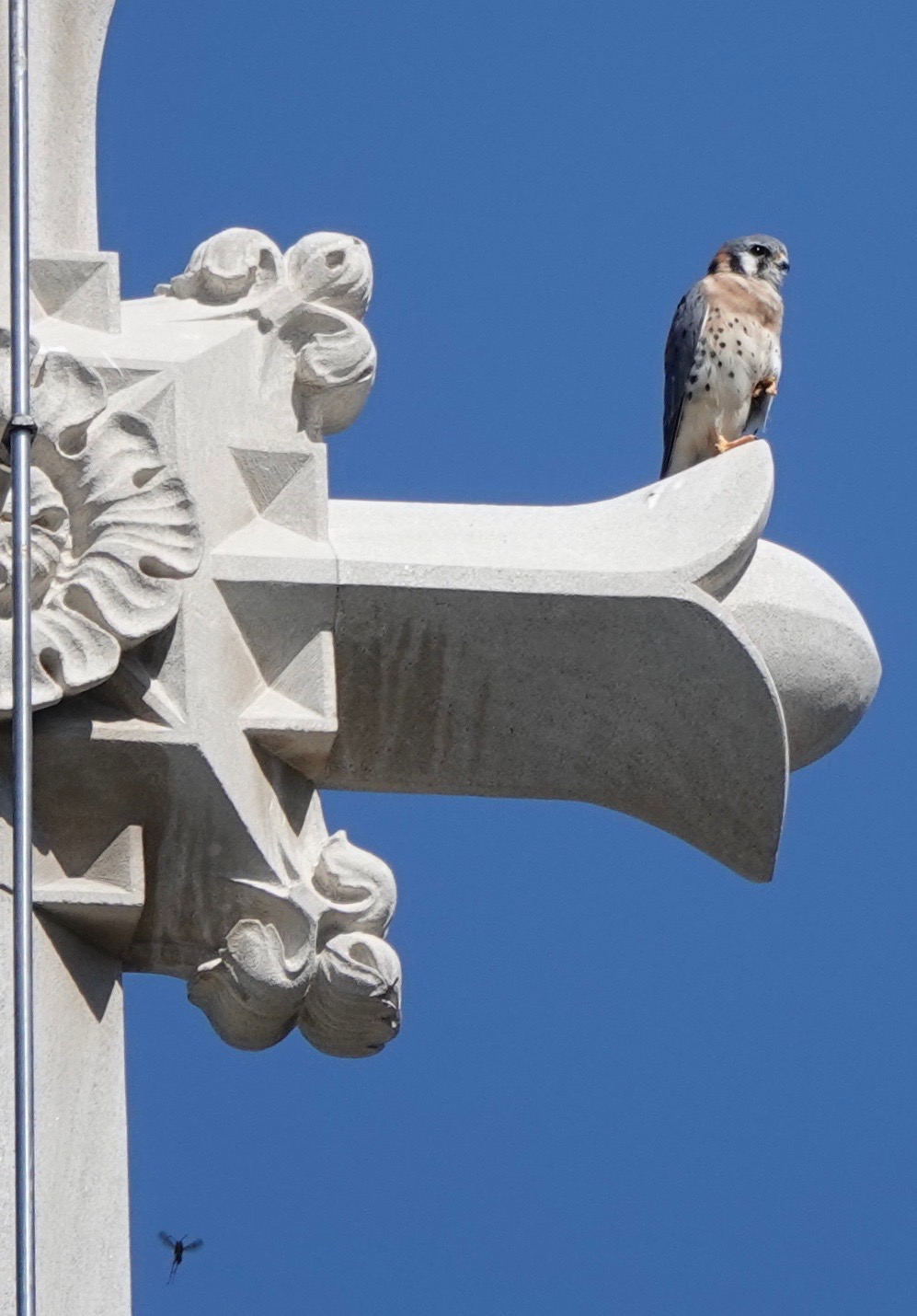 Papa Kestrel atop the Old Chapel has some wasp attendents.