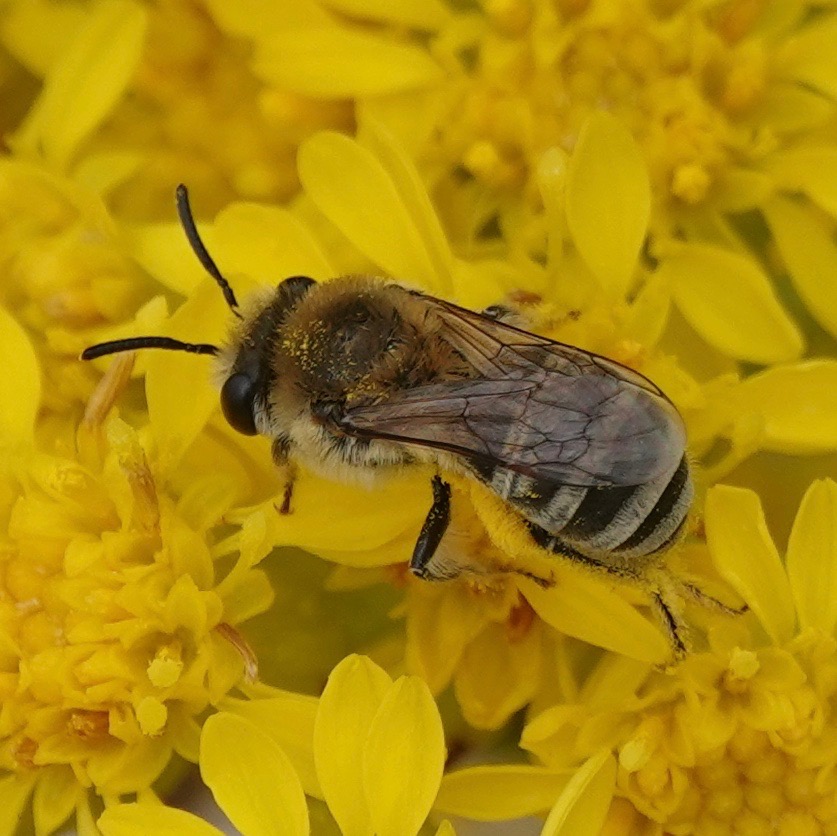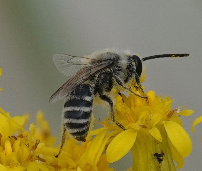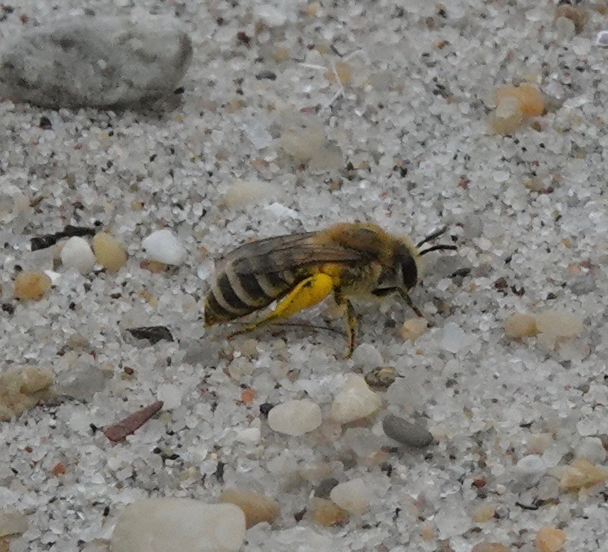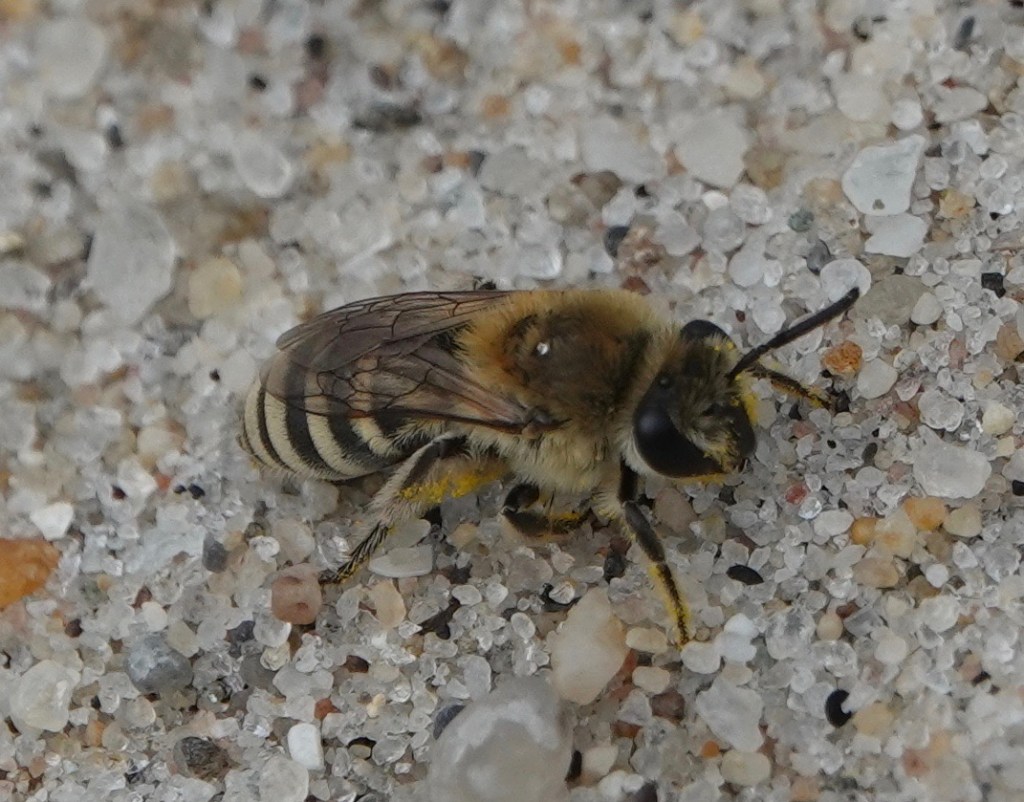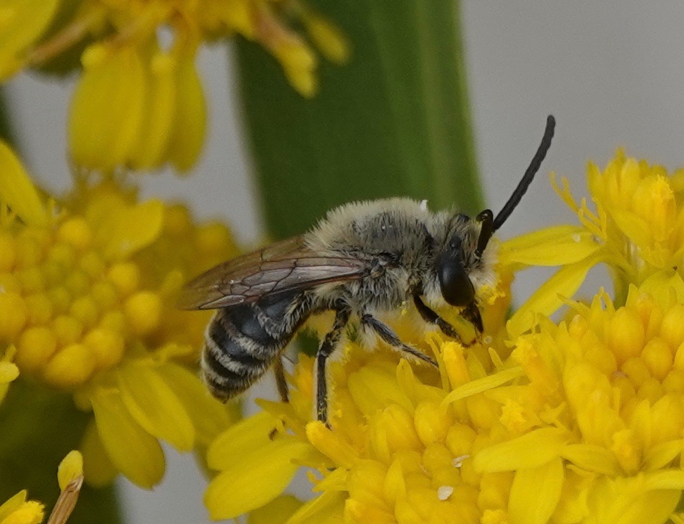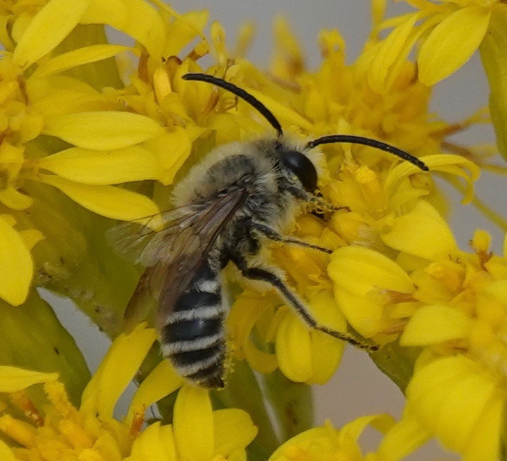 These three, bigger and with shorter antenna, are females of the same species, I think. Beach Dune Cellophane Bee/Colletes speculiferus, I believe. If I’m correct, they aren’t much recorded in NYC. And they make the Colletes genus bees some of the first bees seen in the spring (C. inaequalis) and now some of the last seen in the fall (these C. speculiferus), with the most commonly seen (C. thoracius) seen in May.