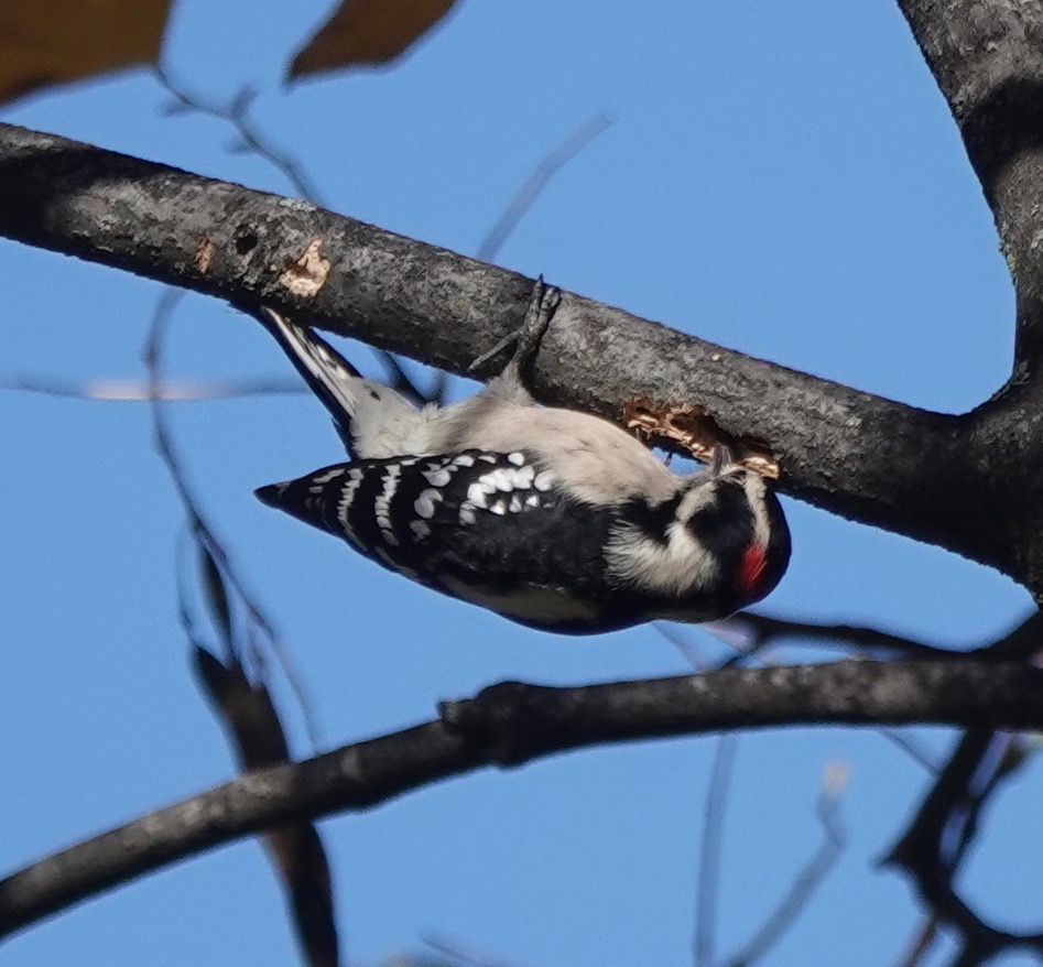 The Downy was doing some serious excavation. This is a Kentucky Yellowwood, which I’ve found these little woodpeckers on before digging hard for some kind of prey in there.