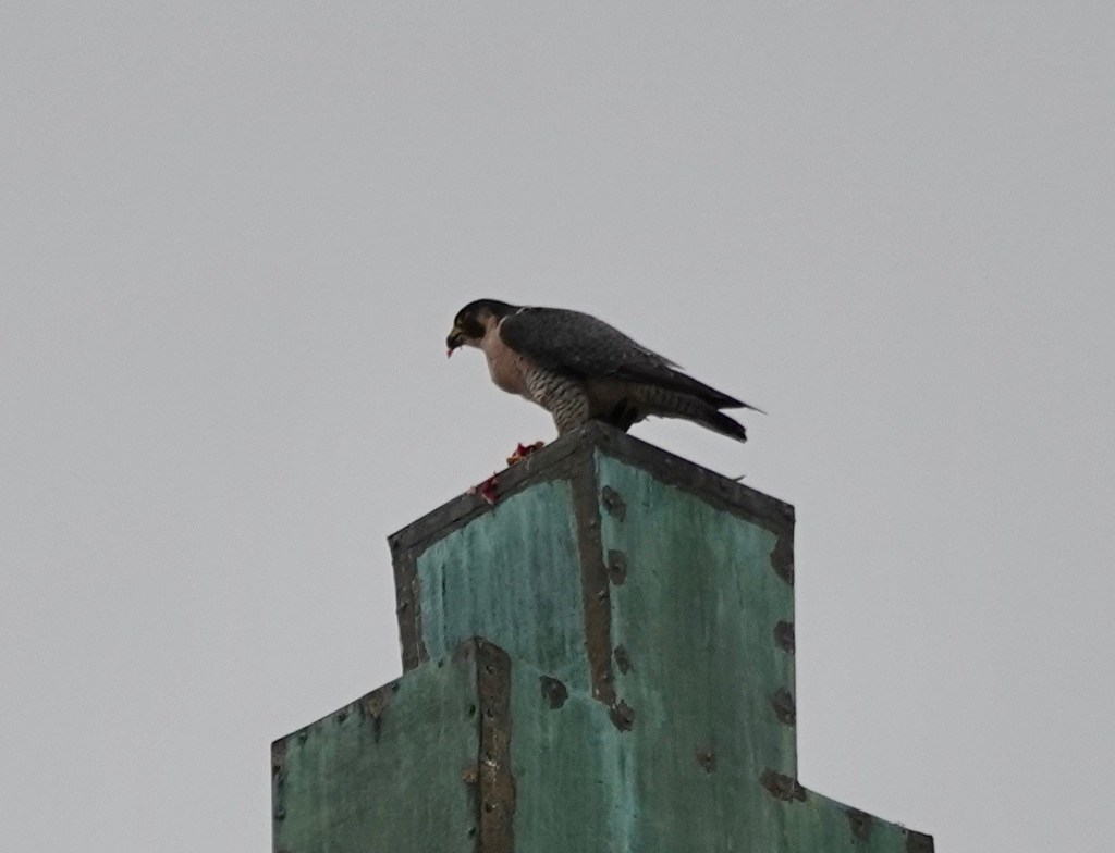 Adult Peregrine atop the butcher’s block, eating the last of what was probably a Feral Pigeon. Note how distended the falcon’s crop is: good bit of meat on a squab.