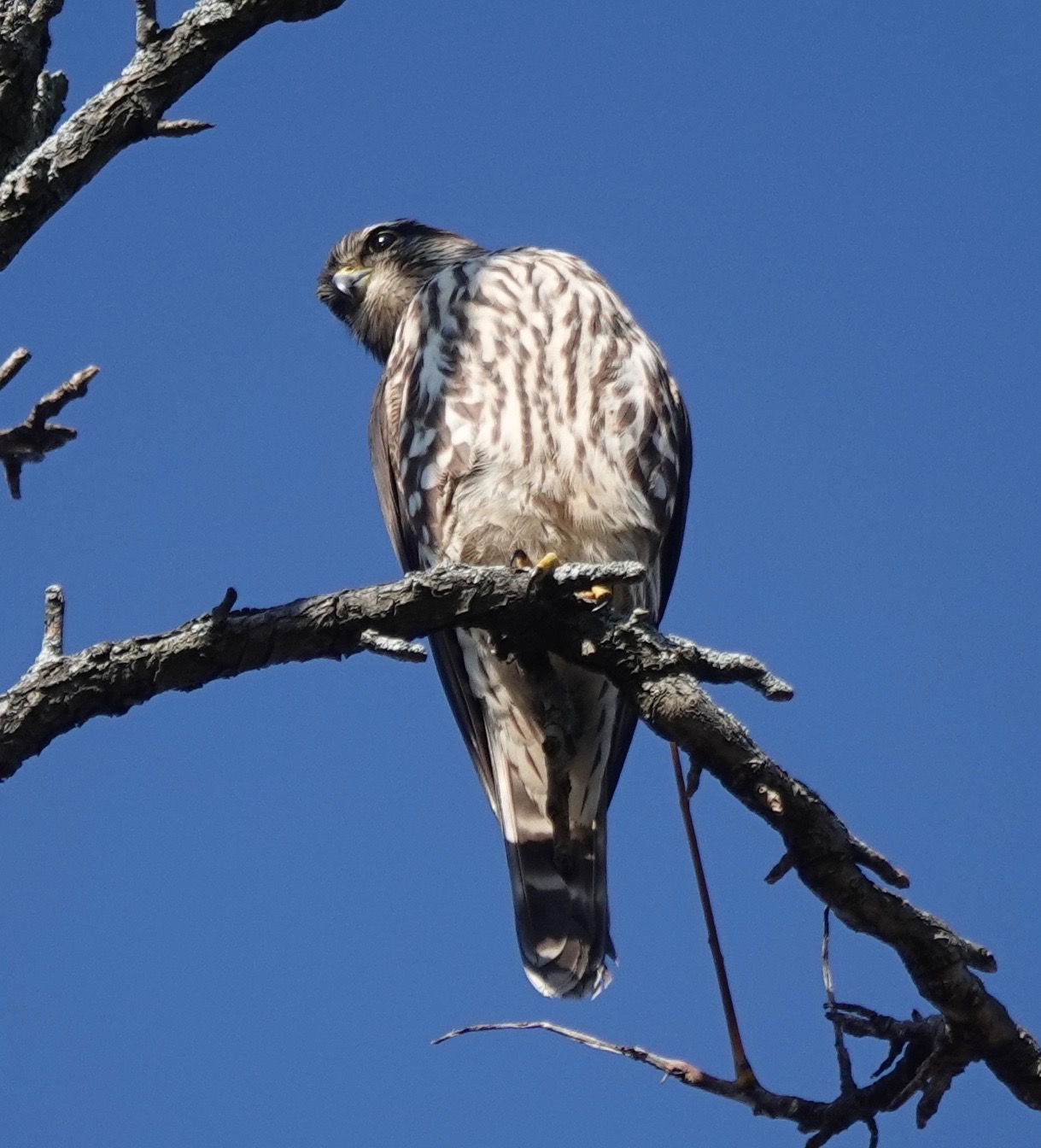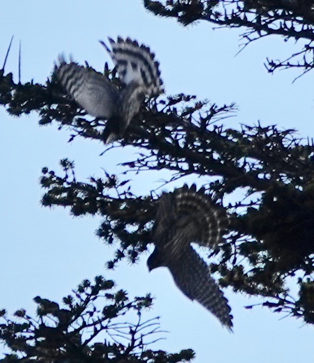 Two Merlin contesting spruce perch, older above/younger below by plumage.