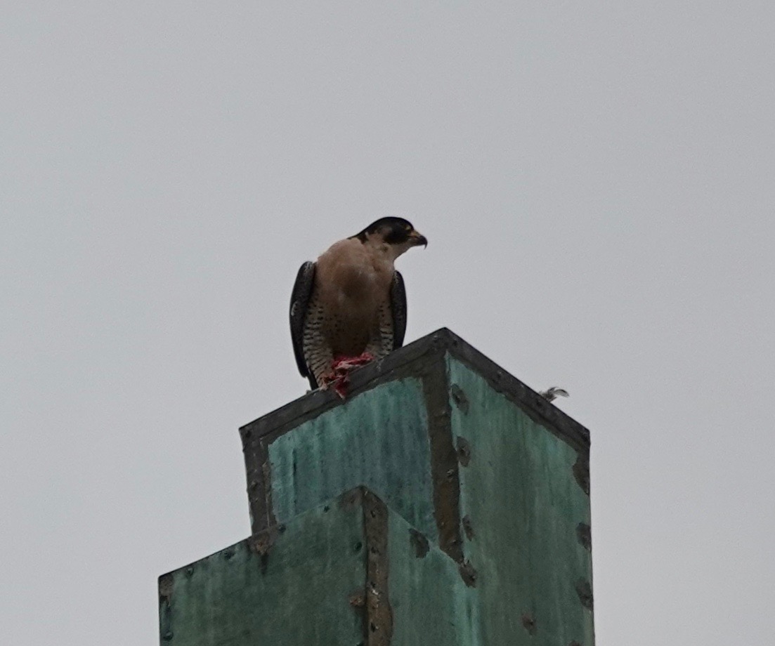 Adult Peregrine atop the butcher’s block, eating the last of what was probably a Feral Pigeon. Note how distended the falcon’s crop is: good bit of meat on a squab.