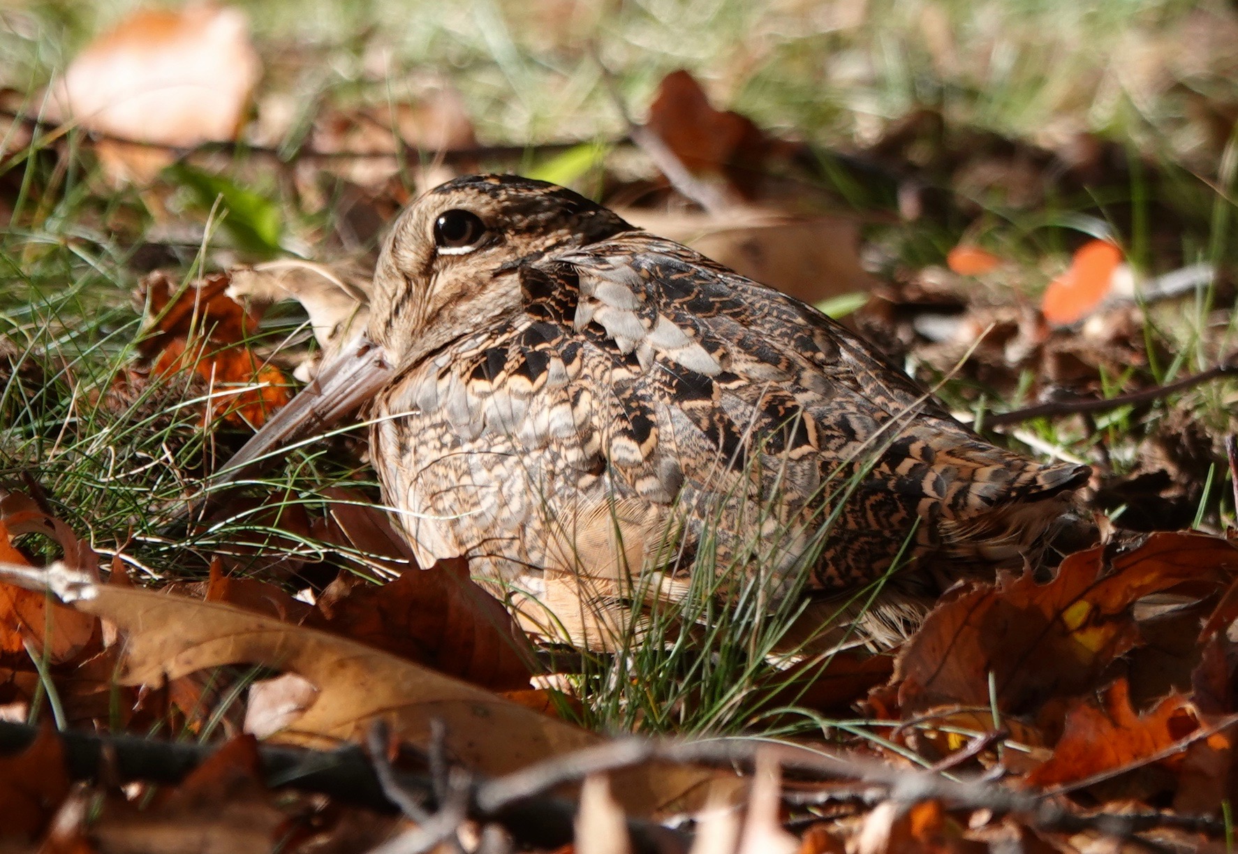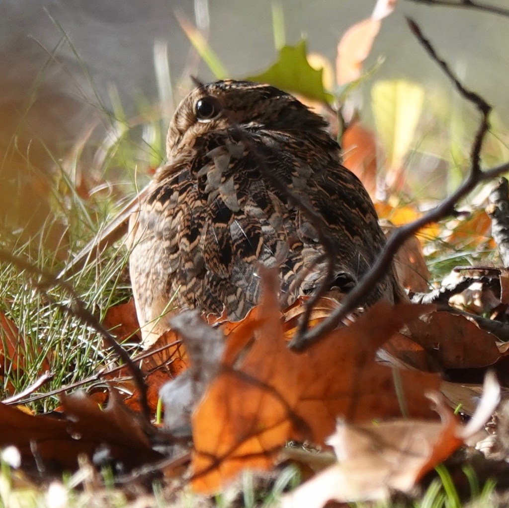 The last American Woodcock we saw here was being eaten. This one, one of three spotted on November 15, was presumably hoping not be eaten.