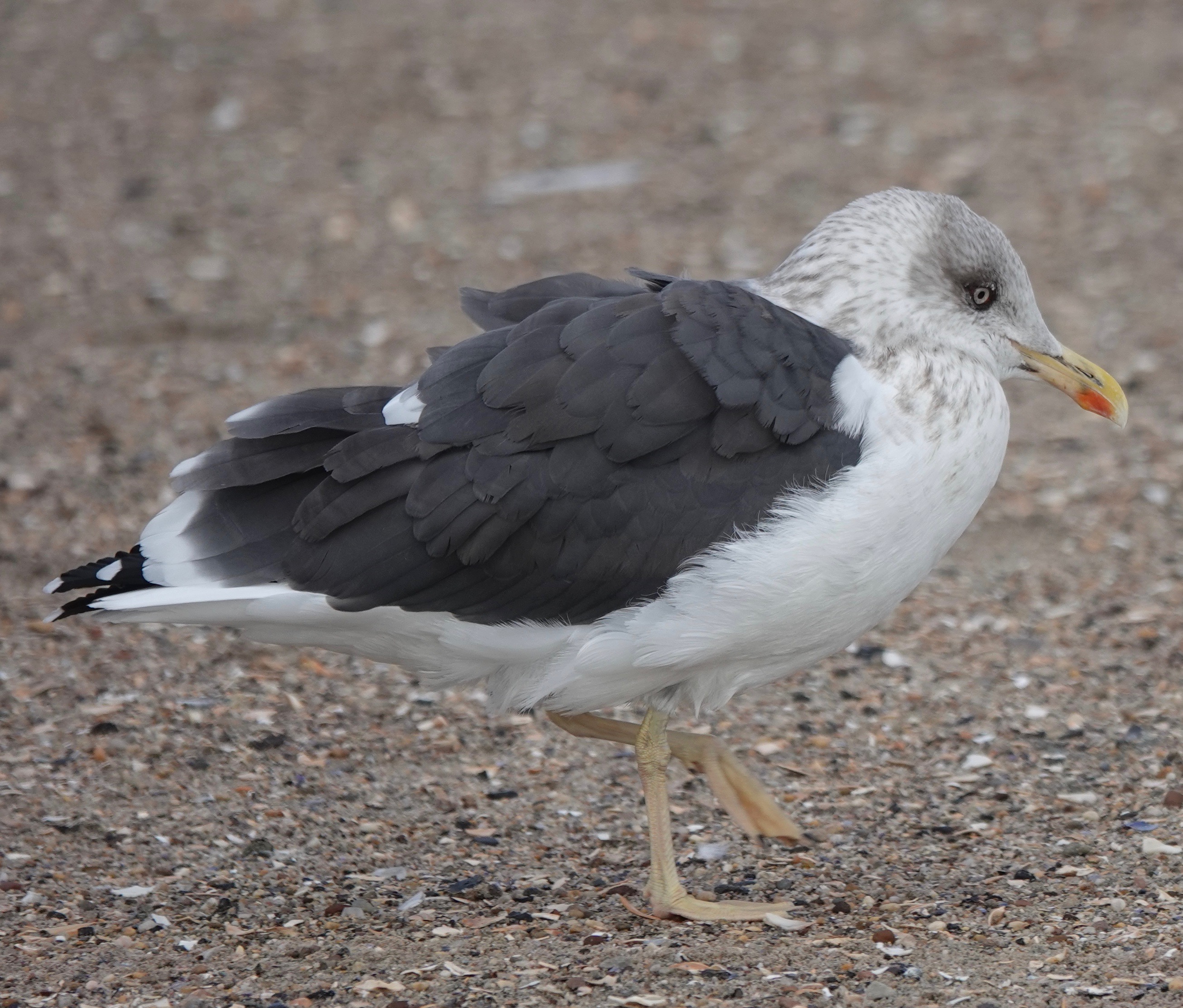 Lesser Black-backed Gull/Larus fuscus on the Coney Island beach, slightly smaller than American Herring Gull/Larus smithsonianus.