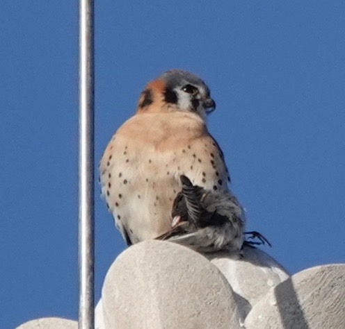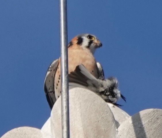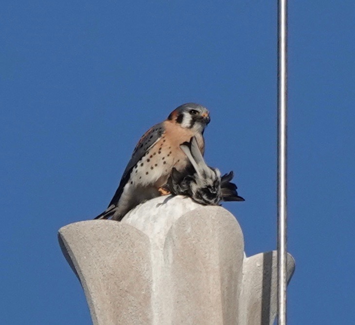 I measure the distance the Kestrel flew to snag the Junco at about 350 ft. Took off from up here and returned to begin plucking and eating.