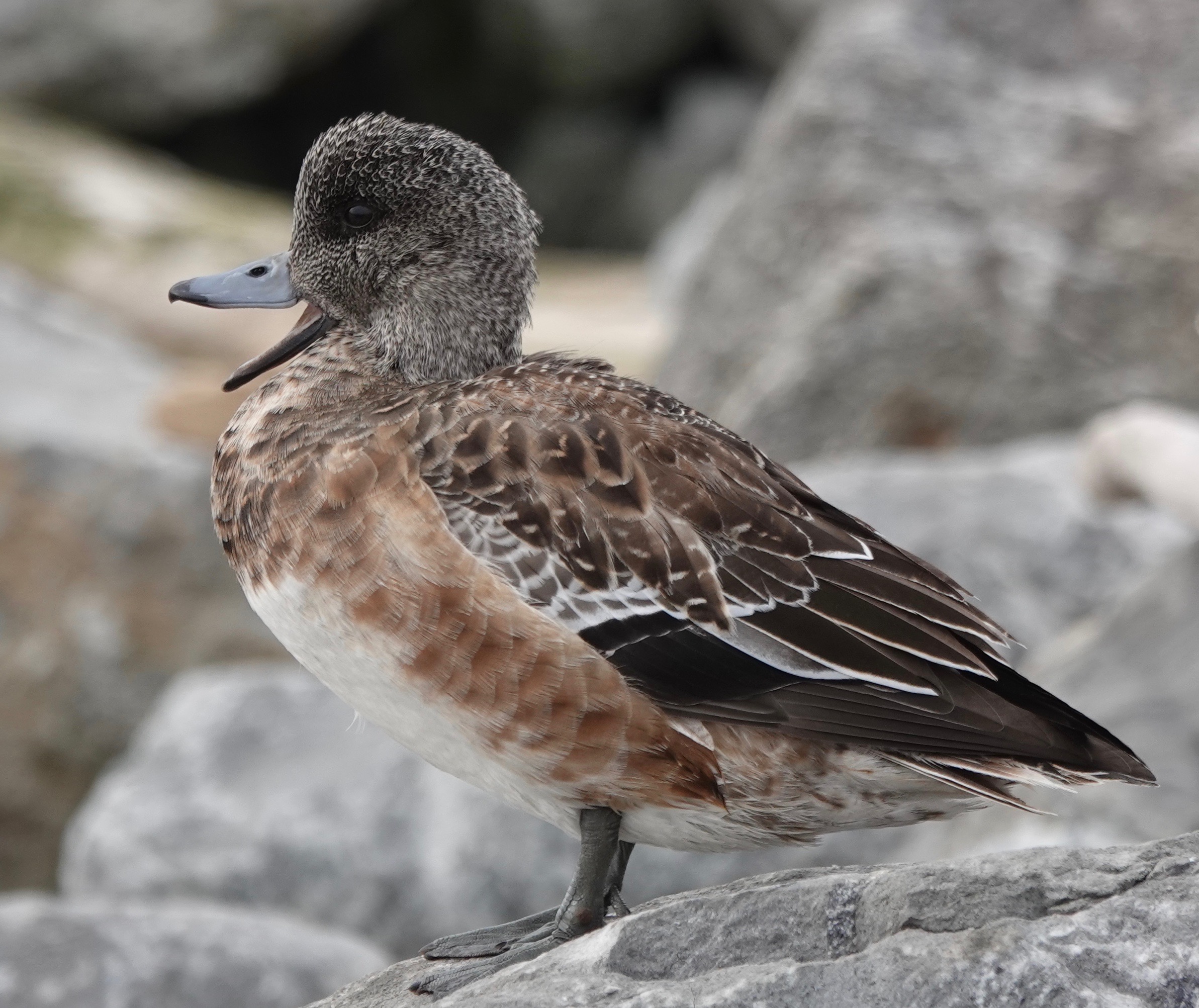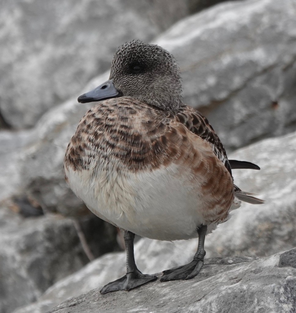 Female American Wigeon on the rocks at Bush Terminal, before it was taken over for use as a helicopter landing pad for Dumpf’s Maduro show trial/Venezuelan oil cornering.