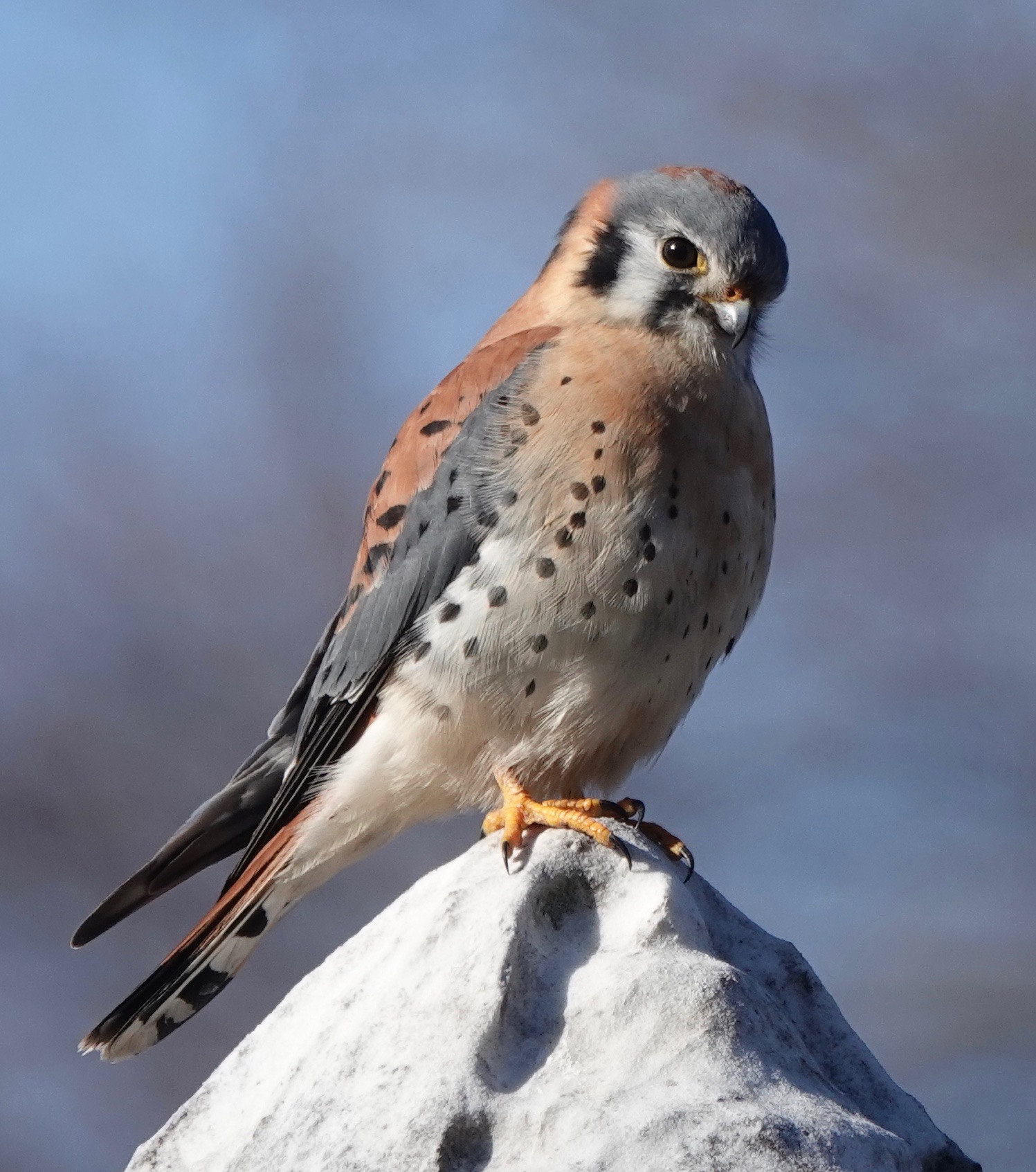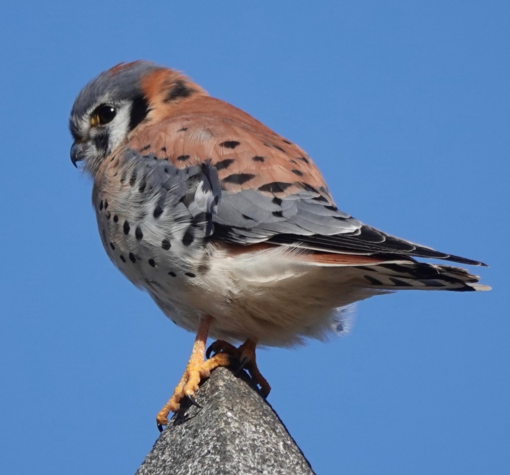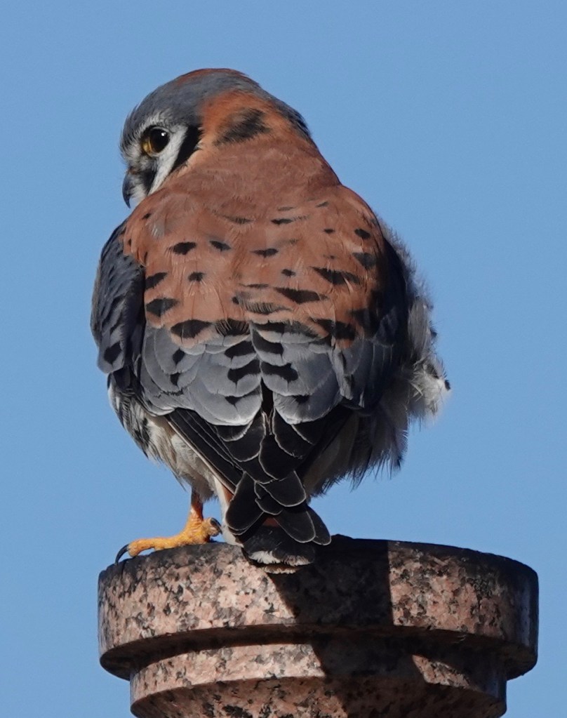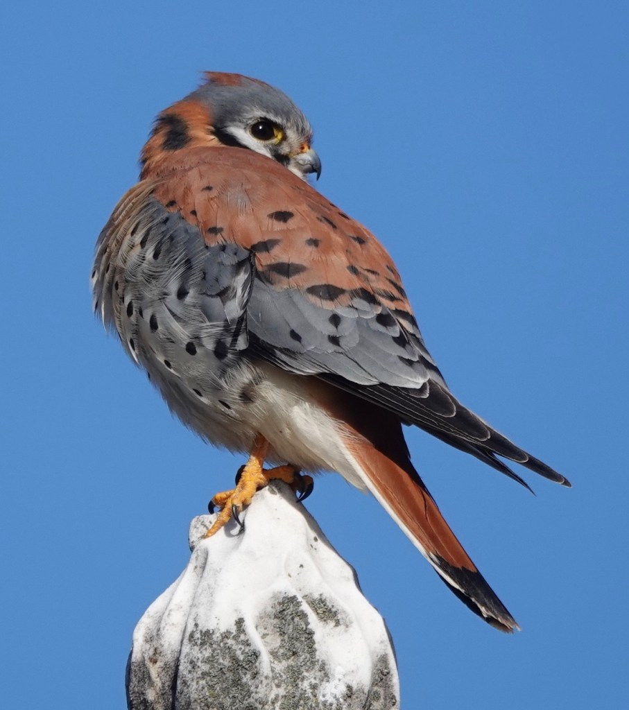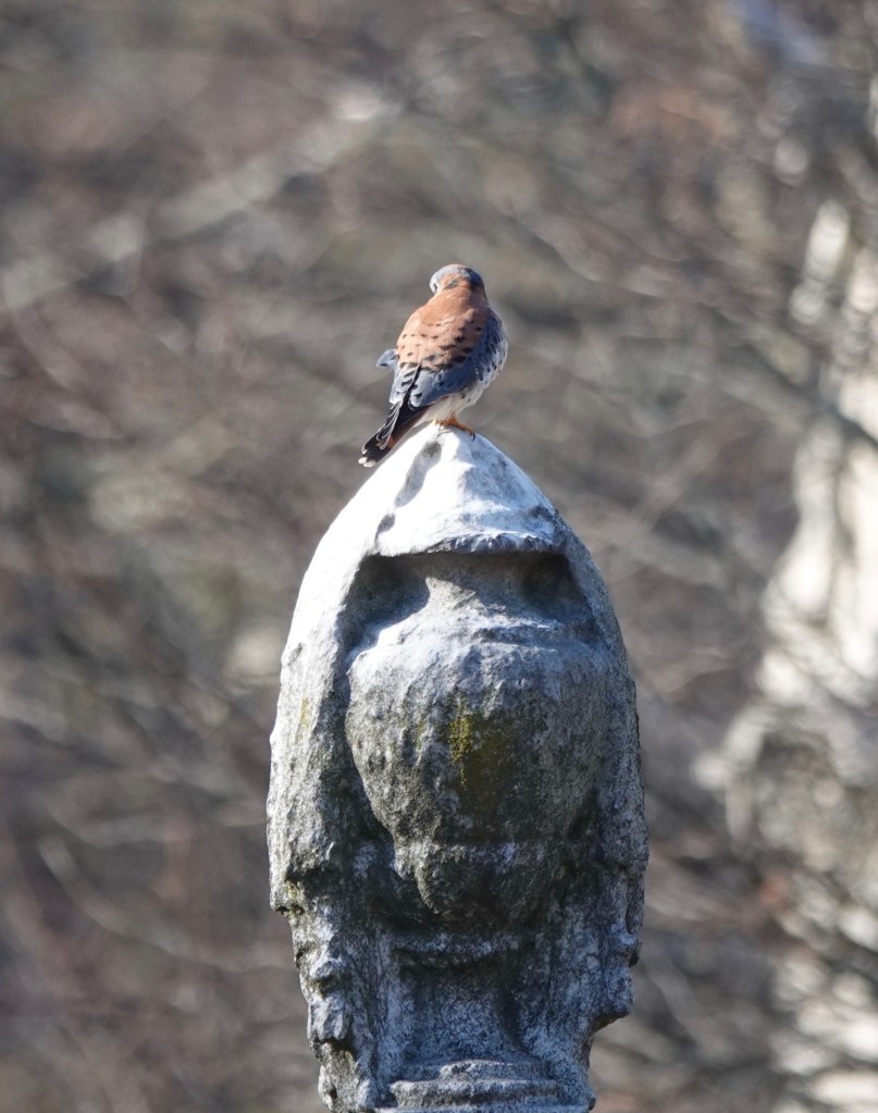 A male American Kestrel jumping from one from funerary column another.
