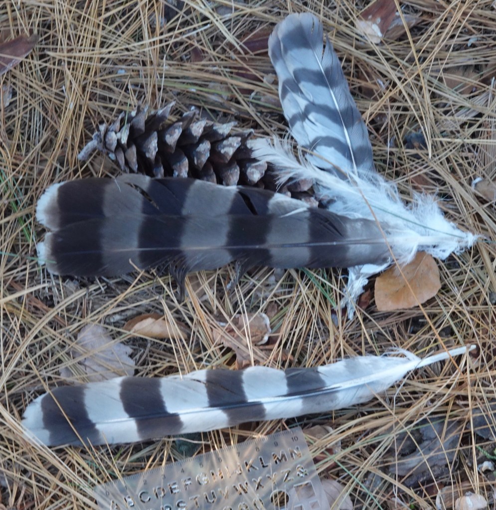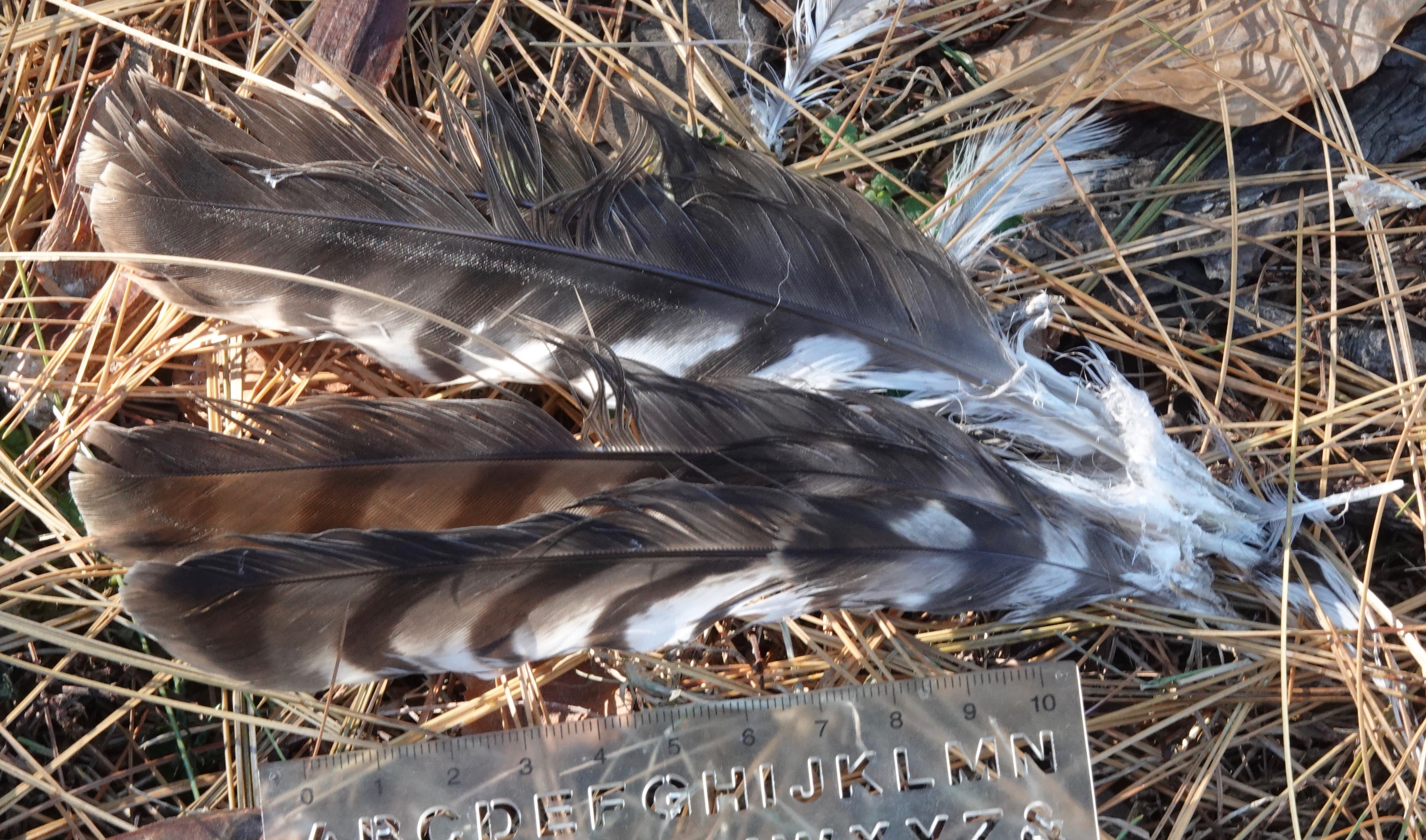 So who might have plucked and eaten a Cooper’s Hawk? Another Cooper’s Hawk is not out of the question; there’s been an adult in the same area recently, doubtlessly drawn by the twin attractions of flocking pigeons and a whole mess of Monk Parakeets. I suppose a Red-tailed Hawk could have done it as well. Great Horned Owl, however, seems unlikely because at night a Cooper’s would be tucked into a tree somewhere, not out and about.