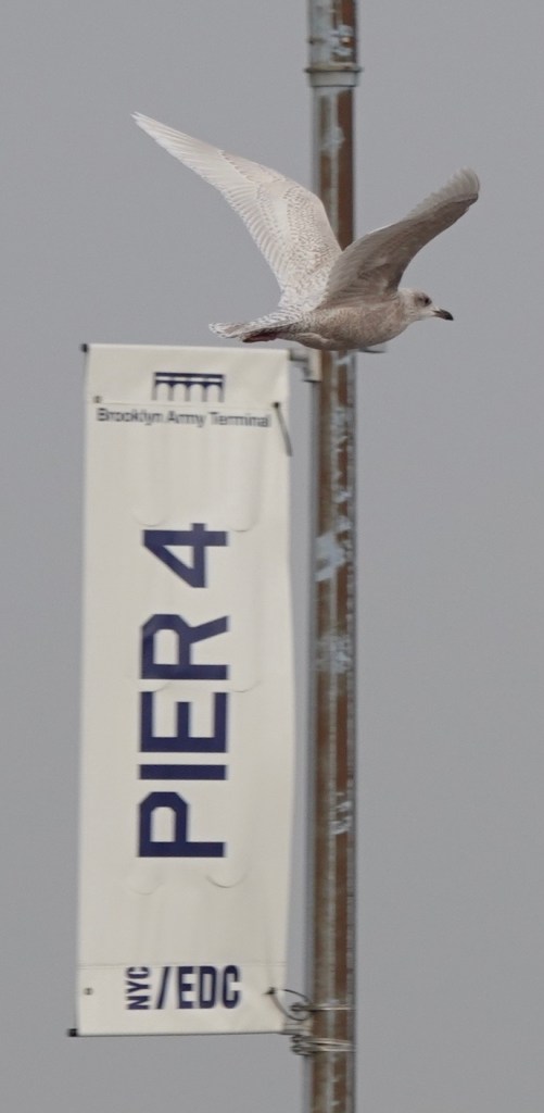 Note the whiteness of the Iceland’s wings. Ring-billed, American Herring, and Great Black-back, the standard local gull species, all have black wing-tips, as the passing Ring-billed shows here.