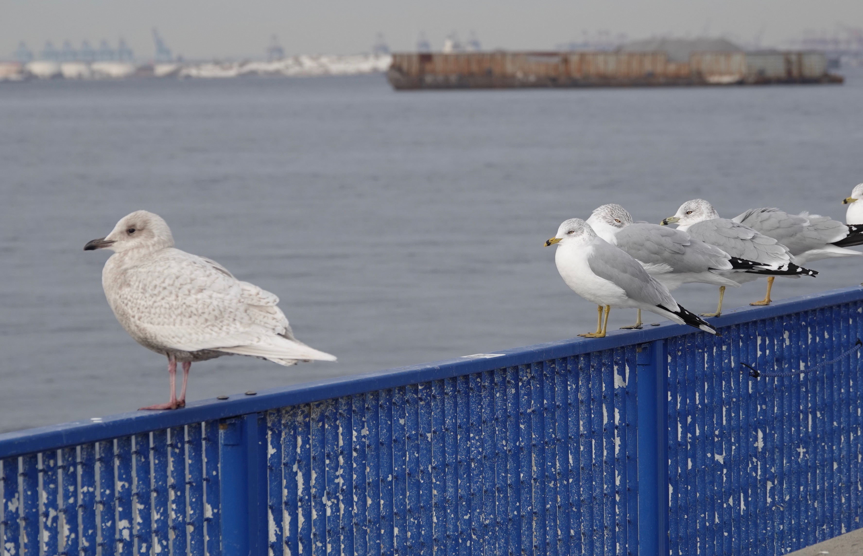 Note the whiteness of the Iceland’s wings. Ring-billed, American Herring, and Great Black-back, the standard local gull species, all have black wing-tips, as the passing Ring-billed shows here.