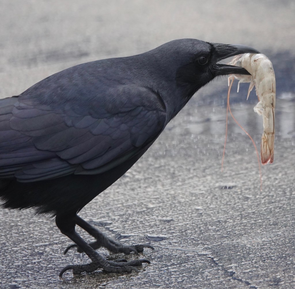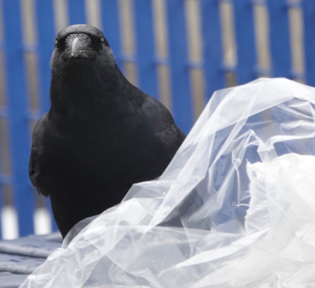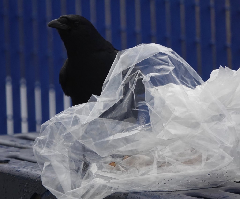 A couple of Fish Crows were poking around this large plastic bag on a bench on Pier 4. There was clearly something inside, but they were having difficulty getting inside, mostly because they were on the wrong end of things.