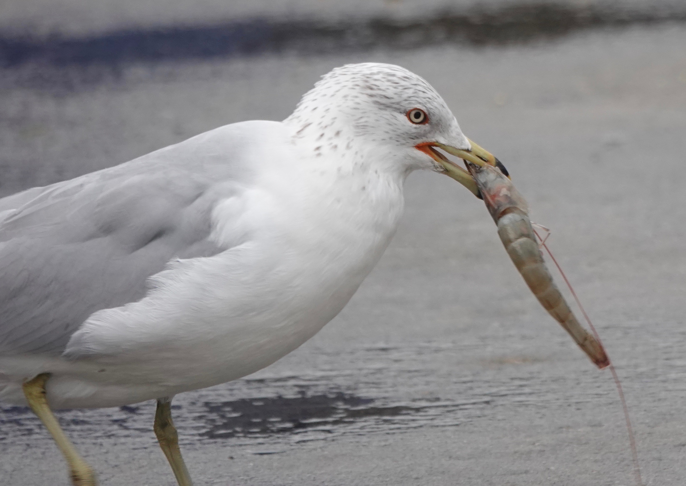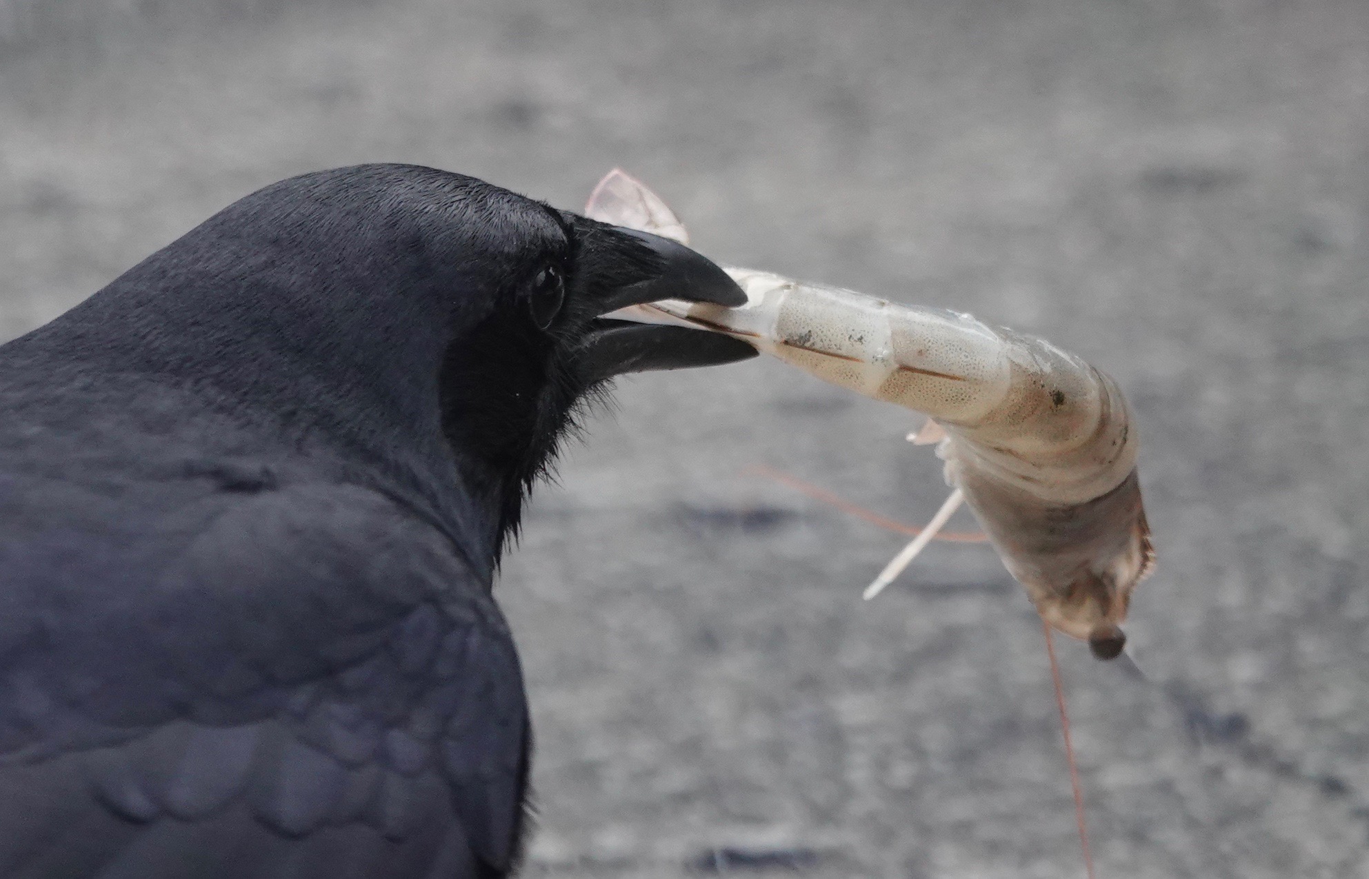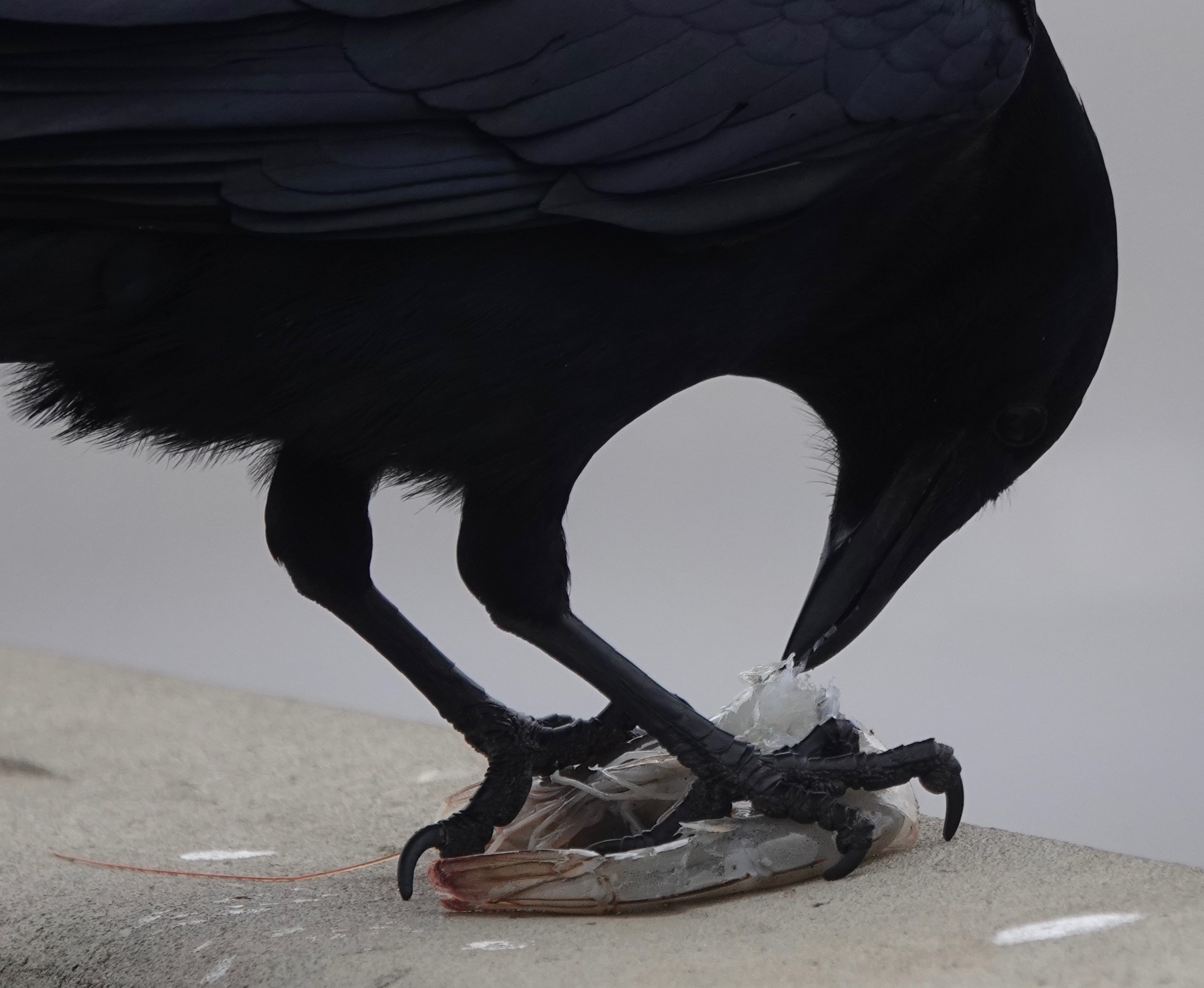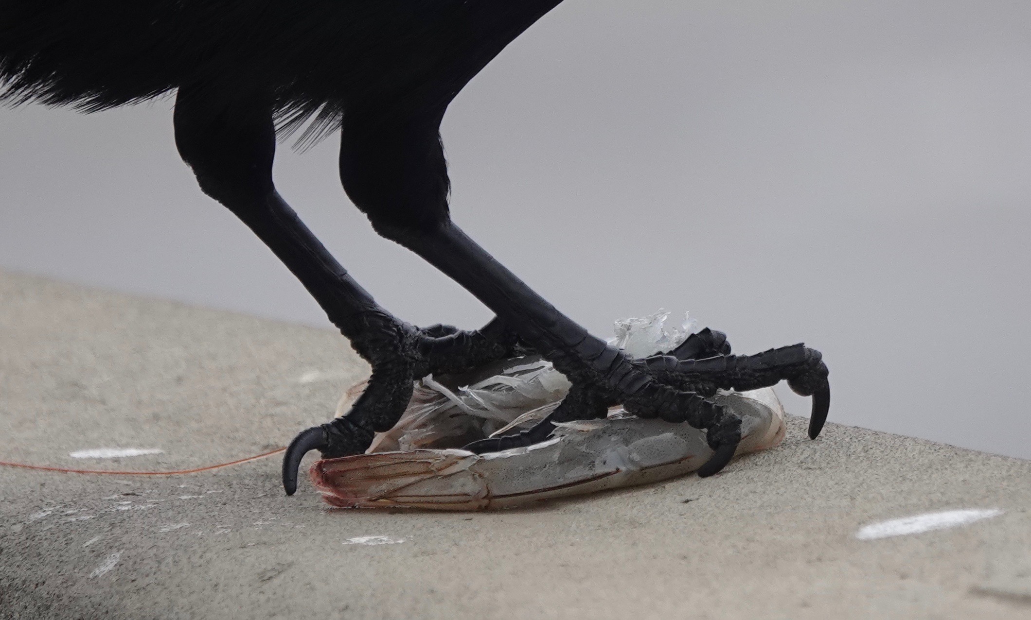 A couple of Fish Crows were poking around this large plastic bag on a bench on Pier 4. There was clearly something inside, but they were having difficulty getting inside, mostly because they were on the wrong end of things.