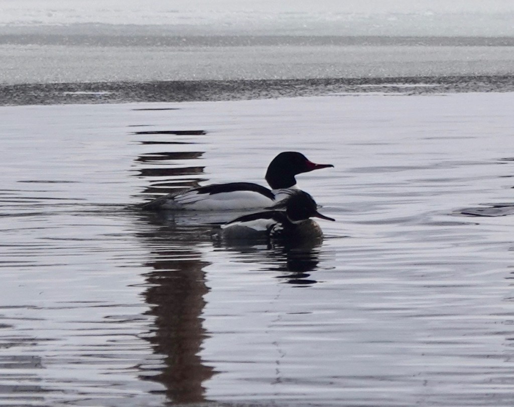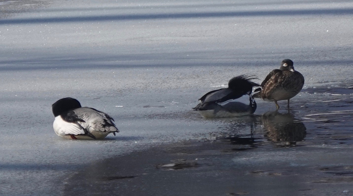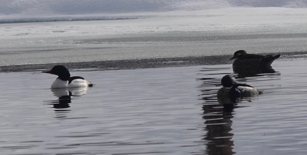 Common Merganser (not common here), Red-breasted Merganser, and Wood Duck on Sylvan Water (and ice).