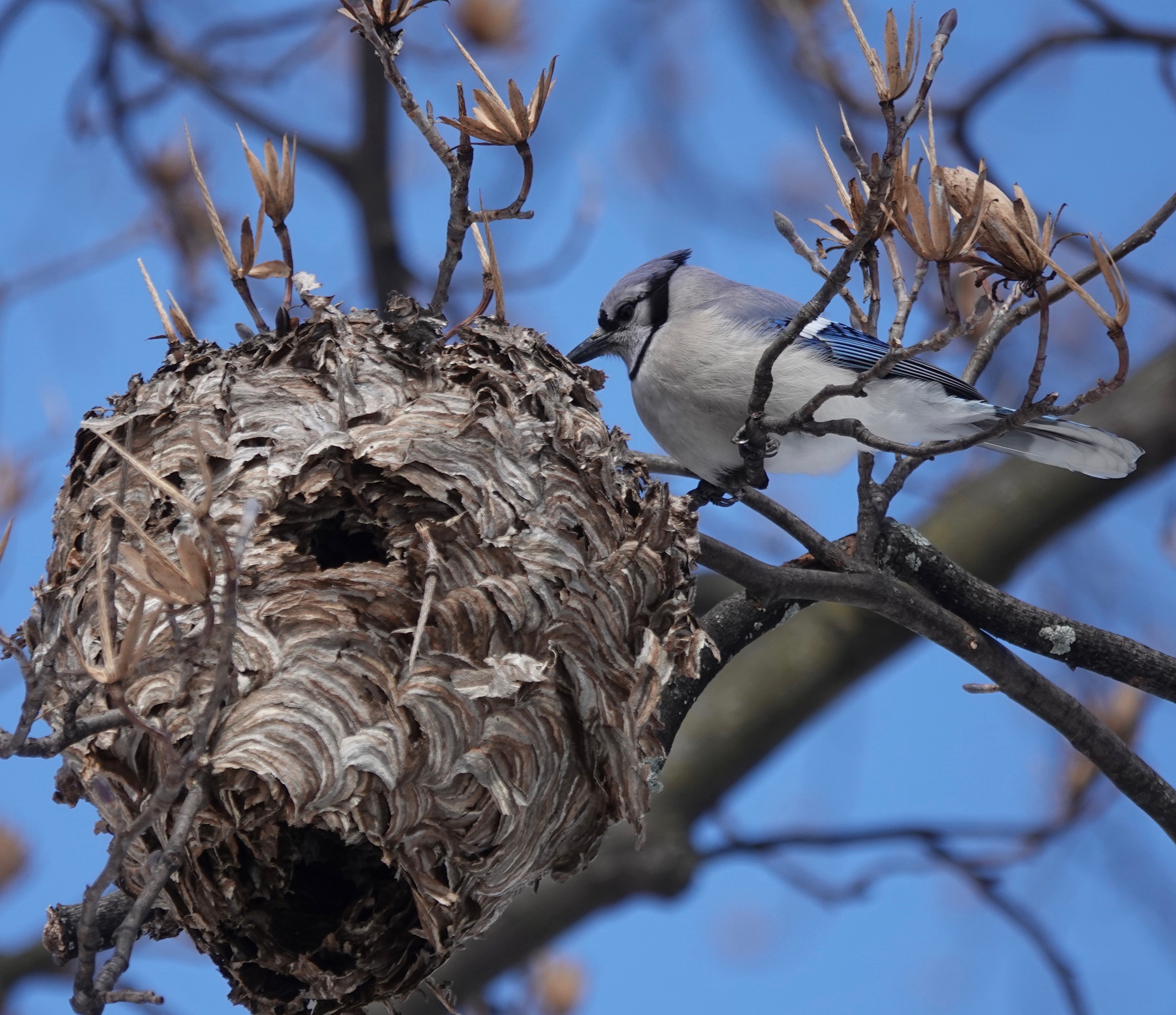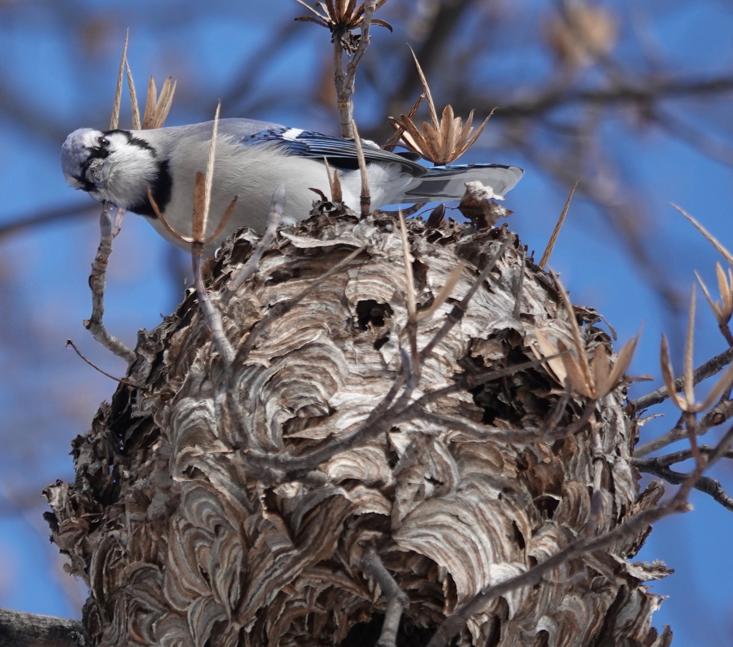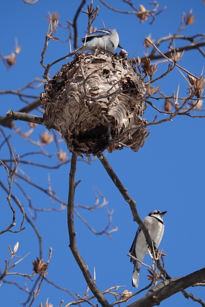 Blue Jays uncommonly interested in an old Bald-faced Hornet nest.