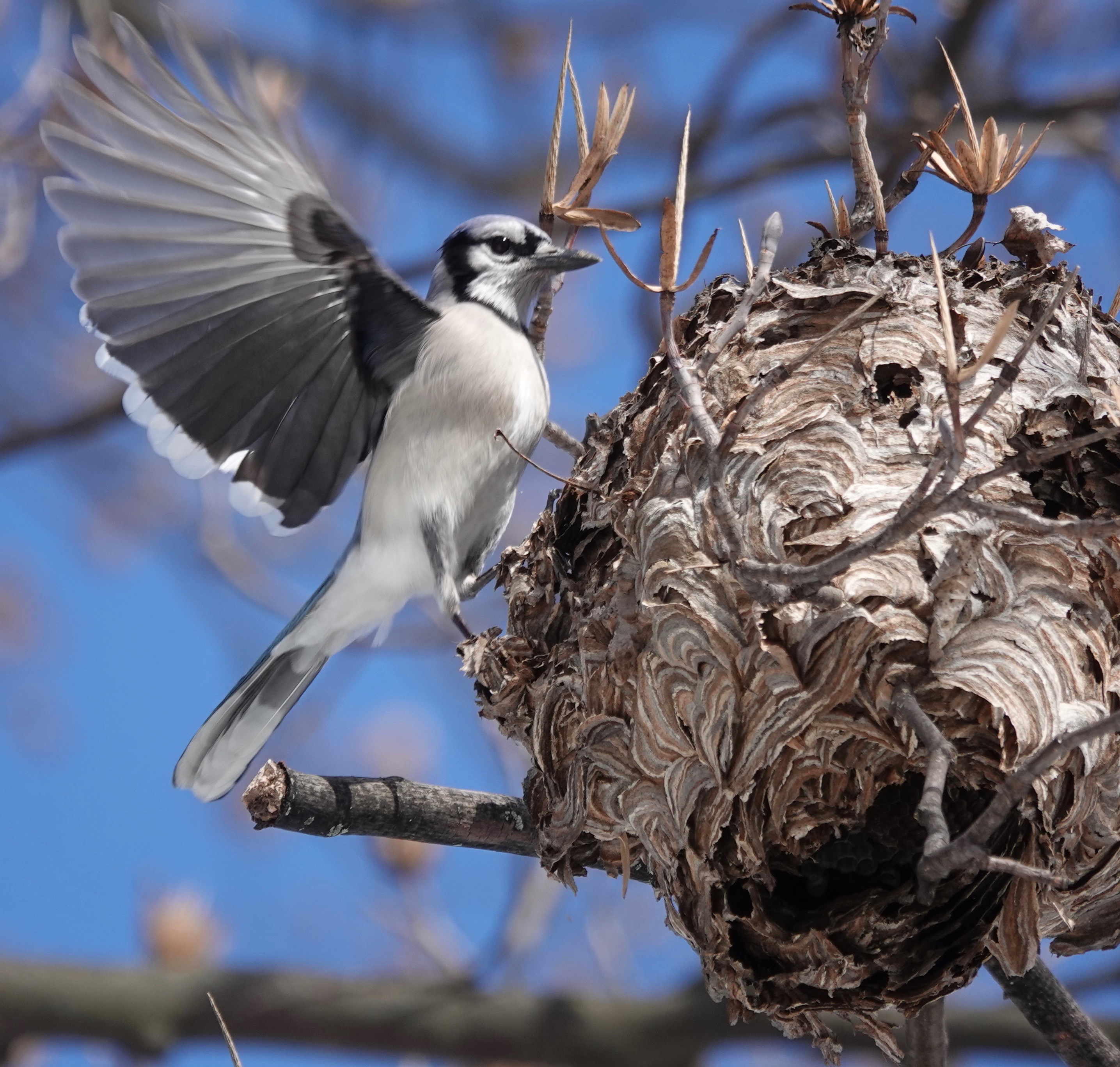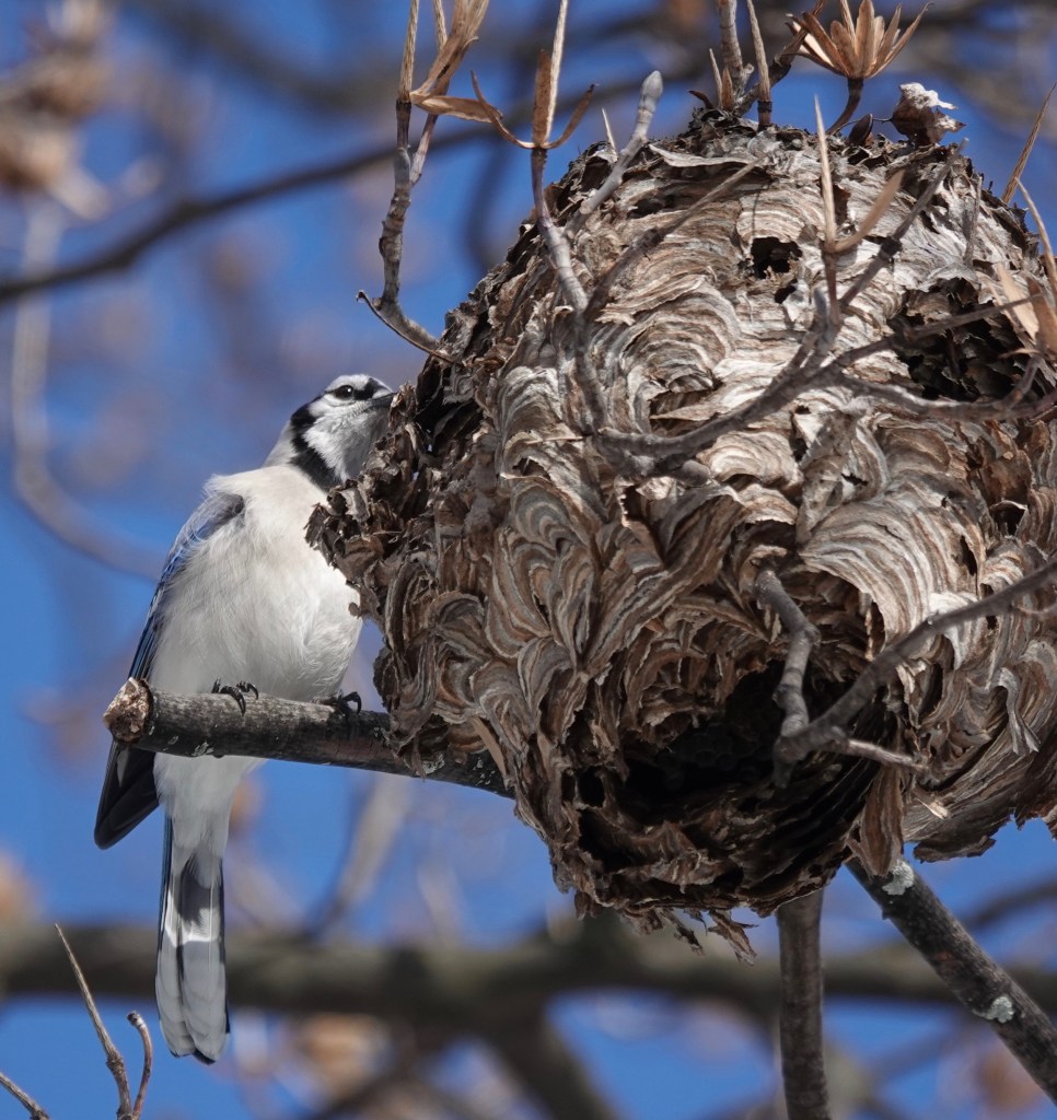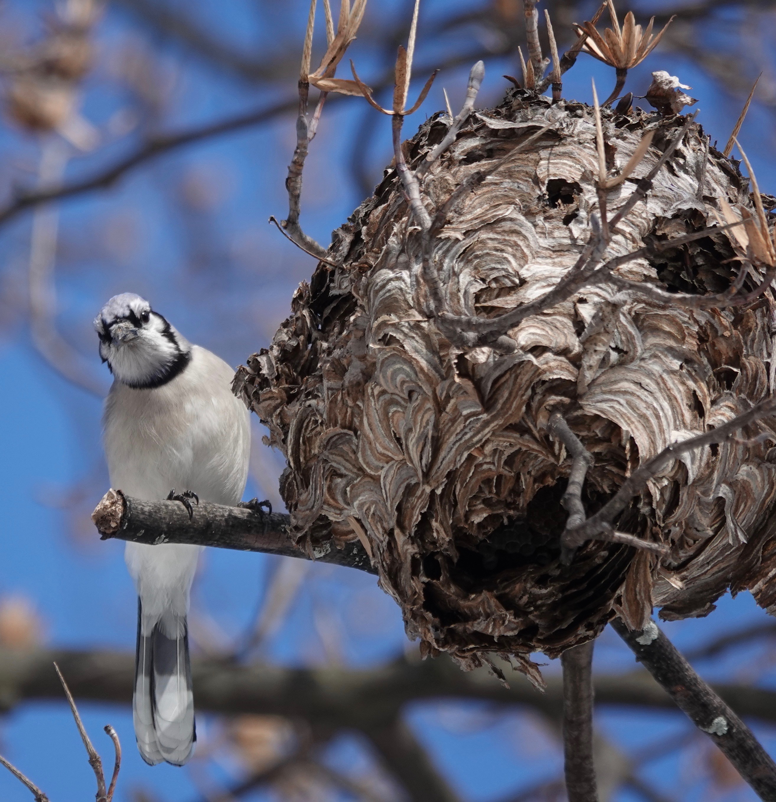 Blue Jays uncommonly interested in an old Bald-faced Hornet nest.