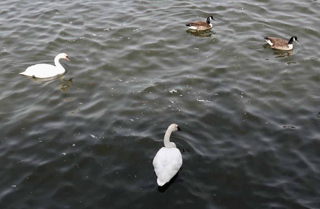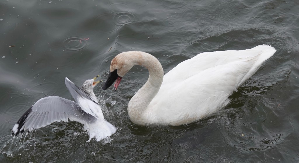 Here seeing off a Ring-billed Gull who was going for the mostly sinking corn bits someone was throwing in.