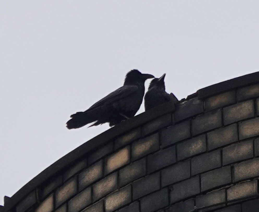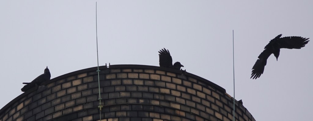 Two Ravens chased each other around and around while one waited on the rim of the smokestack
