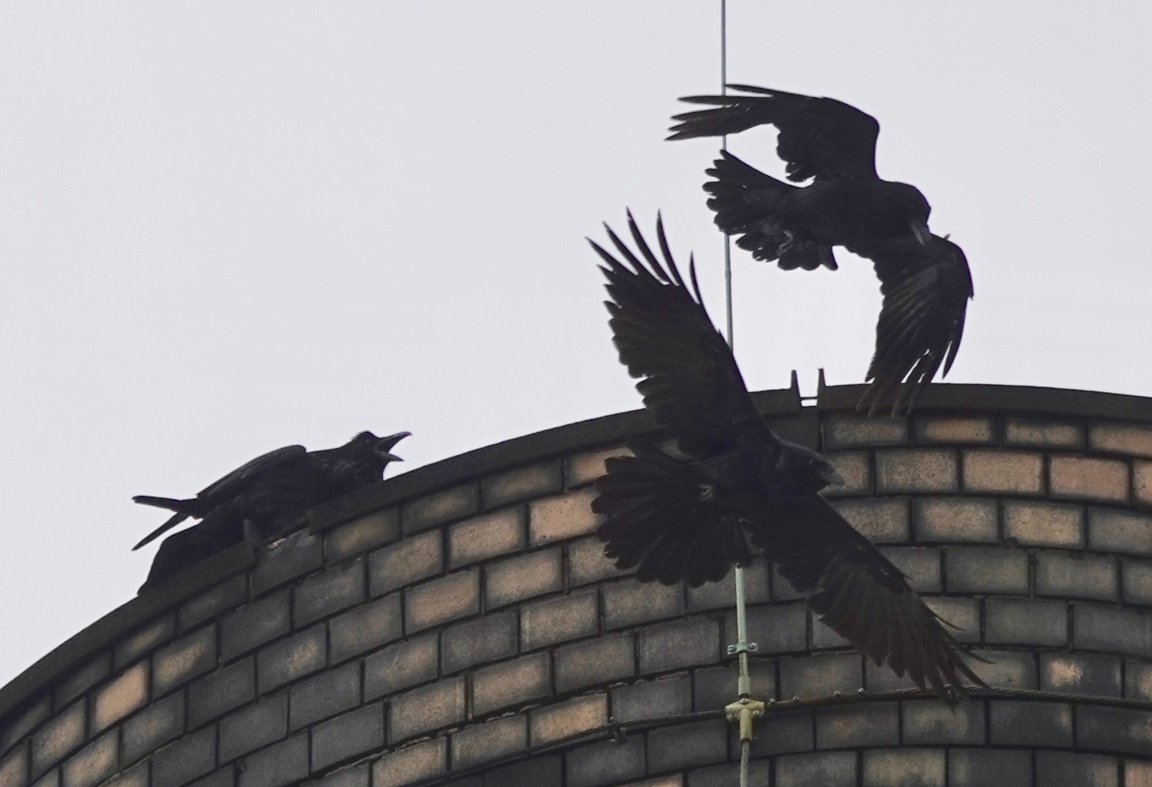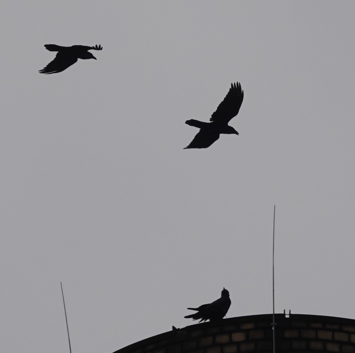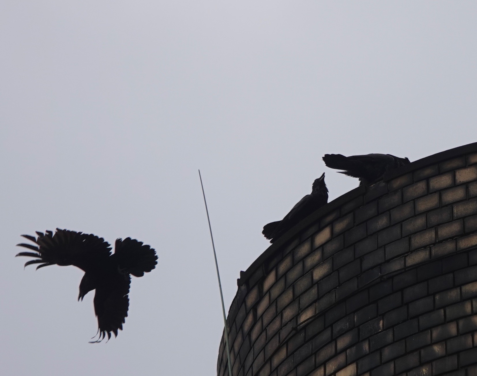 Two Ravens chased each other around and around while one waited on the rim of the smokestack