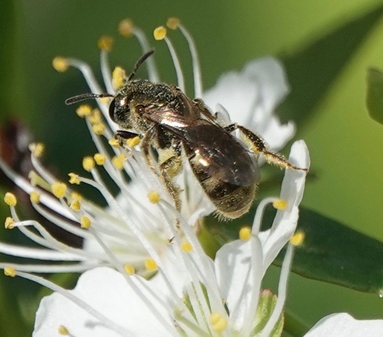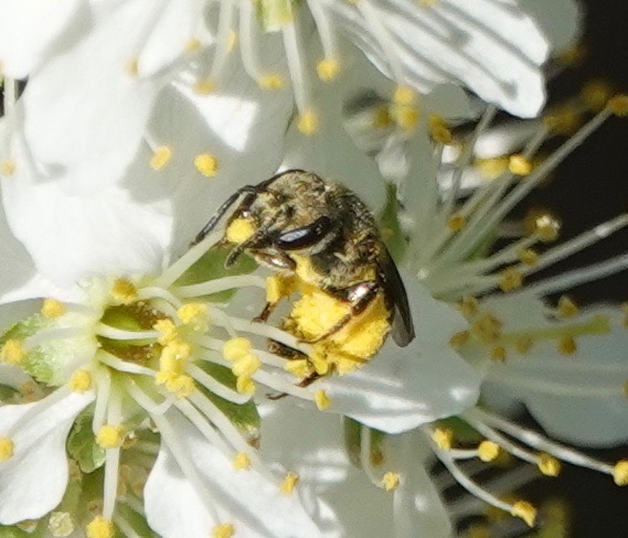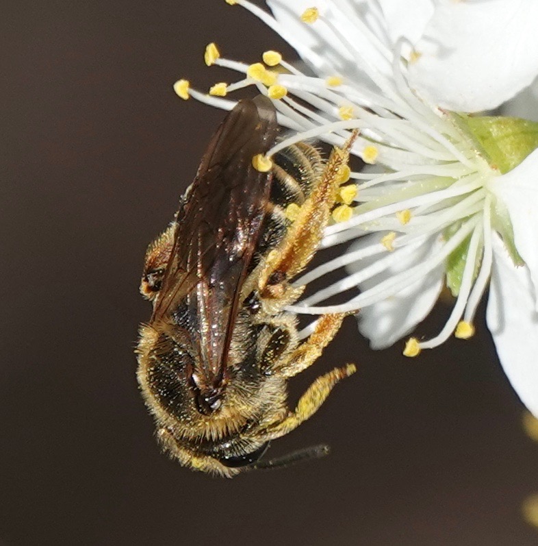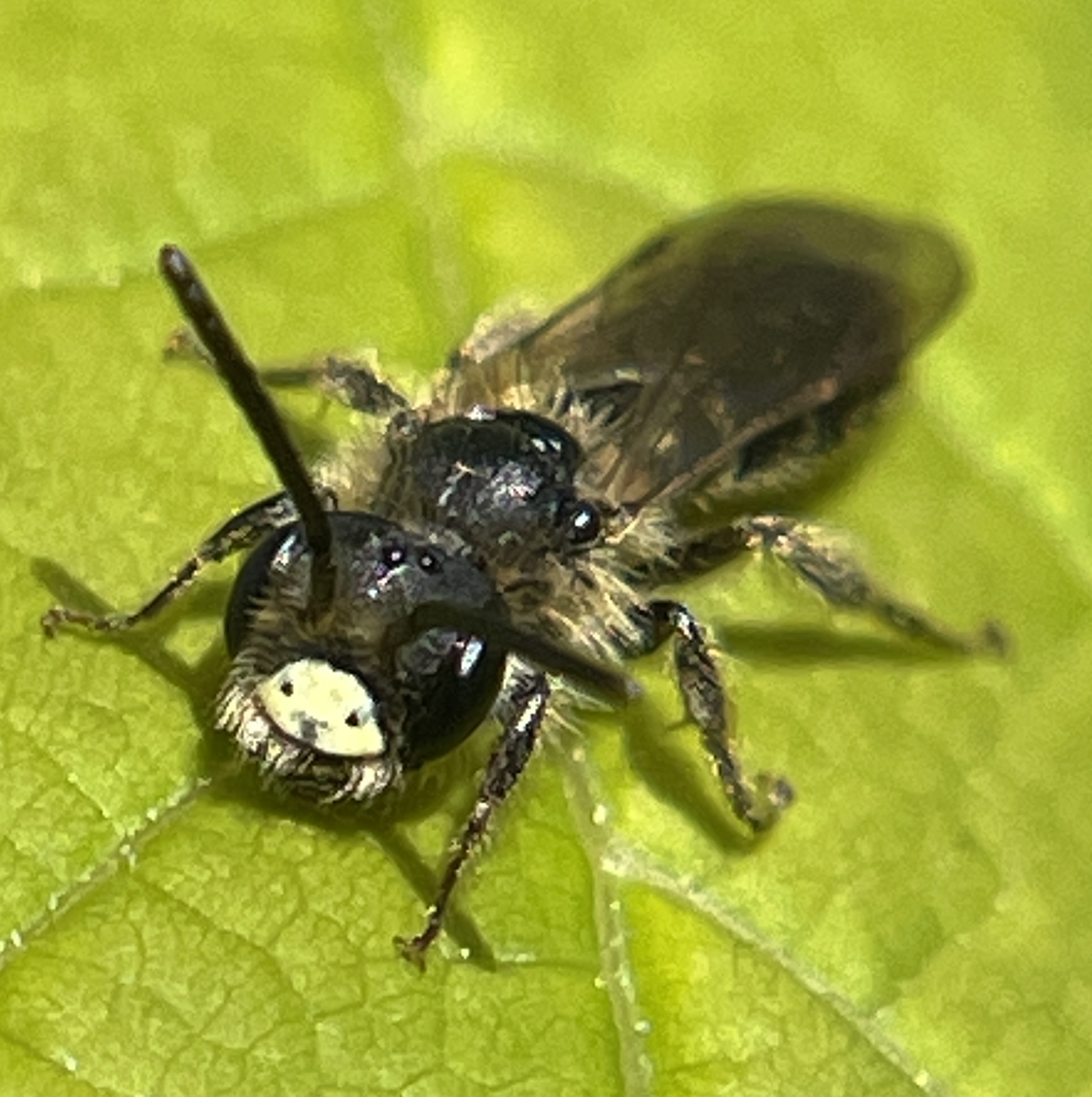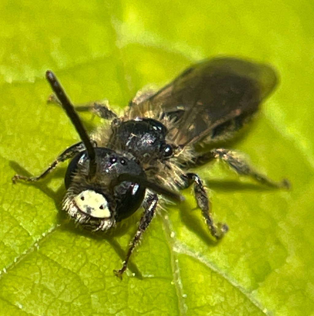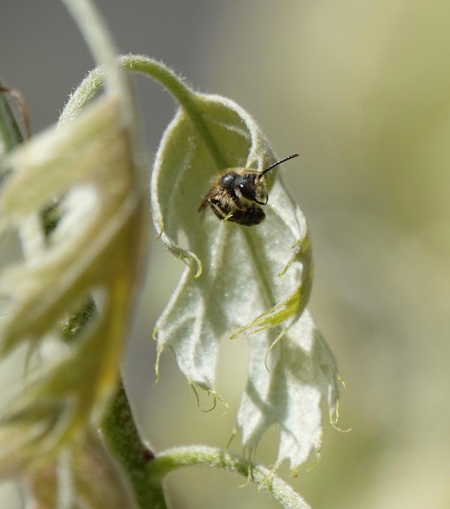 We had a couple days of temperatures in the 80s, exciting all the critters, but then things plummeted into overnight 30s. Here’s a small bee clutching a baby oak leaf on a cool morning.